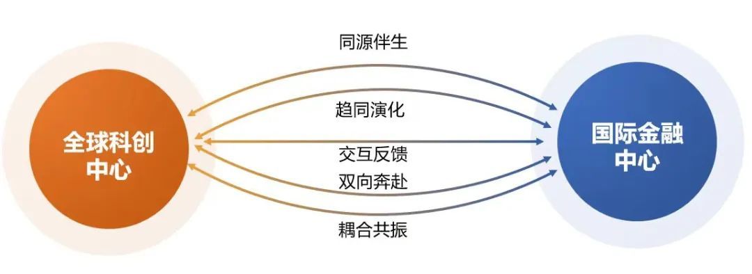这两个中心之所以重合度非常高,是因为金融支持是科创中心建设的核心要素之一,科创中心建设又会推动金融中心发展。两者之间存在正向反馈作用,能促进区域经济结构转型升级和产业能级跃迁。研究报告将“双中心”建设的关系概括为:同源伴生、趋同演化、交互反馈、双向奔赴和耦合共振。
