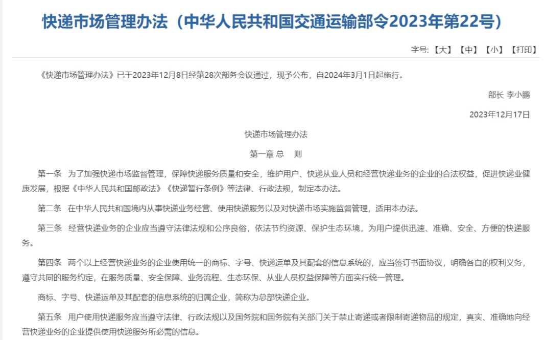 将于2024年3月1日起施行,其中规定:未经用户同意,擅自使用智能快件箱、快递服务站等方式投递快件,情节严重的将处1万元以上3万元以下的罚款。