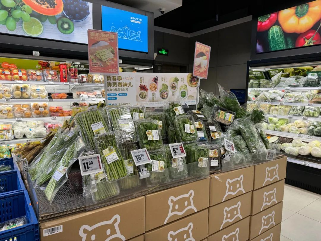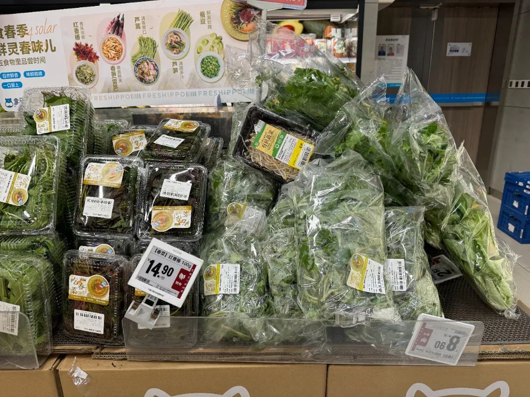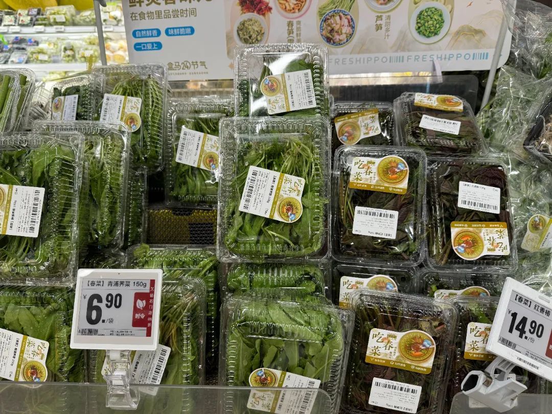 线下门店盒马生鲜的新品春菜同样正在热销。为了方便广大顾客选购,超市在生鲜区专辟了春菜专区,芦笋头、青浦荠菜、红香椿等时令春菜争“鲜”占据C位,散发清新的气息,吸引不少市民驻足挑选。
