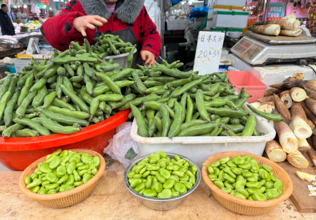 宁夏豌豆苗20元/斤、韭菜4元/把、小白菜6元/斤……在三角地东安菜市场,记者看到,摊位显眼位置整齐摆放了蚕豆、春笋、豌豆苗等各式春菜,色泽青翠欲滴,十分诱人。“春节过后,荠菜、蚕豆、春笋这种都很好卖,每天来买的人很多。”一位摊主向记者介绍道,蚕豆富含蛋白质,营养丰富,现阶段很畅销,菜场目前供应剥壳蚕豆和未剥壳蚕豆两种,供居民选择。