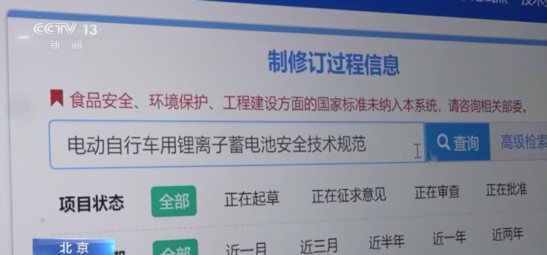 记者在国家标准化管理委员会官方网站查询到,2022年由工业和信息化部组织起草的强制性国家标准《电动自行车用锂离子蓄电池安全技术规范》已完成起草和征求意见阶段,目前正处于审查阶段。