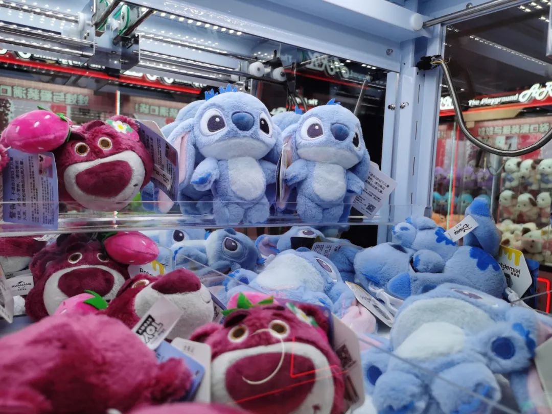 此次新增的夹机站专区,位于门店主入口,乘坐商场扶梯至B1层即可找到。专区采用淡粉色的亮眼设计,营造了一处令人心情愉悦的玩耍空间。现场摆放了数十台娃娃机,设备内满是迪士尼正版钥匙圈、当红IP玩偶等受人喜爱的产品。