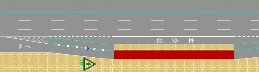 港湾式公交站范围内,为提升非机动车通行安全,提示非机动车道后绕站台产生的线形变化及站台位置,在非机动车道线形变化处布置相应导向箭头,并在港湾式停靠站渐变段外侧侧石上布置突起路标。