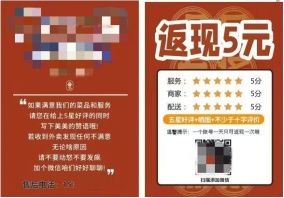 近日,金山区市场监管局接到消费者举报,称其在所点的外卖中发现商家附带有一张“好评返现”卡,上面写有“五星好评+晒图+不少于十字评价,返现5元”字样,下方还附有商家微信二维码。