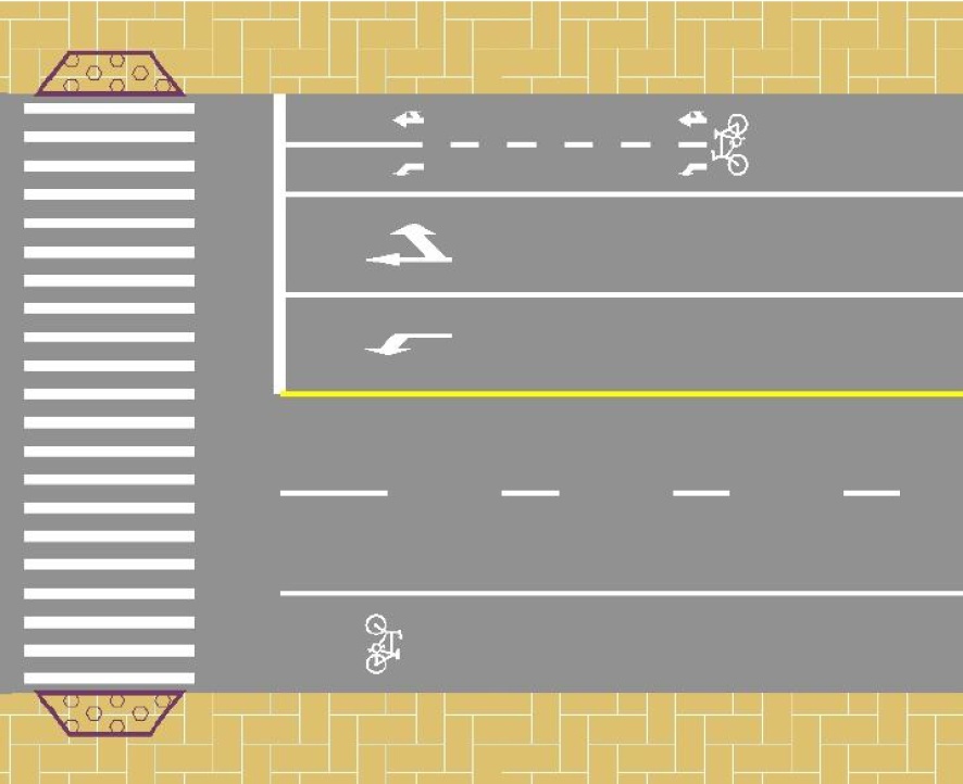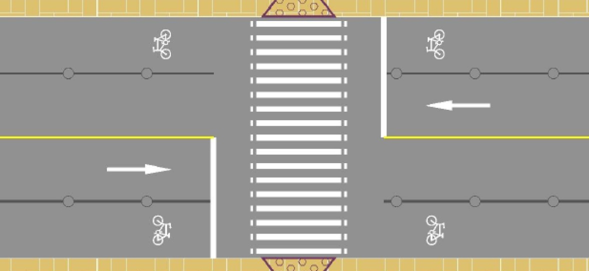 港湾式公交站范围内,为提升非机动车通行安全,提示非机动车道后绕站台产生的线形变化及站台位置,在非机动车道线形变化处布置相应导向箭头,并在港湾式停靠站渐变段外侧侧石上布置突起路标。