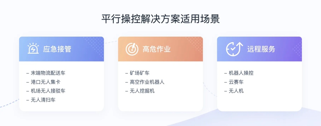 另外,声网的平行操控解决方案也可用于应急接管、高危作业和远程服务等业务场景。首先应急接管,以无人车为例,无人车目前被广泛应用在机场、码头、港口等地方,但应用过程中往往会出现如暴风雨、交通管制、突发事故等一些无法自主决策的场景。相较此前需要人为介入到现场处理,平行操控则可以更快、更低的成本解决这个问题。在井下矿车、高空作业机器人、无人挖掘机等危险指数较高或环境恶劣等高危工作场景中,平行操控也可以很好地发挥价值。远程服务,如机器人、云赛车、无人机之类的场景,操作者可以借助云服务操控这些无人值守设备。
