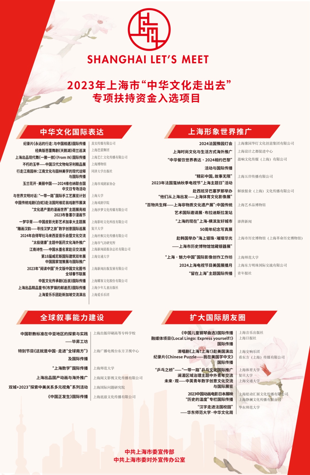 近日,2023年上海市“中华文化走出去”专项扶持资金项目评审和2023年上海市“银鸽奖”评选结果揭晓。经专家评审,2024法国豫园灯会国际传播、现代舞《一撇一捺》(From IN)国际传播、纪录片《Chinese Puzzle——我在美国学中文》国际传播、与世界文明对话:“一带一路”国际手工艺展览计划、“雕画汉韵——寻找汉梦之旅”数字创意国际巡展等46个项目脱颖而出,入选2023年上海市“中华文化走出去”专项扶持资金项目;2023年上海市“银鸽奖”评选吸引650余件作品与项目参评,经专家评定,207件作品与项目分获“最佳奖”和“优胜奖”。其中,由上海市社联所属上海市社会科学事业发展研究中心(《学术月刊》杂志社)报送的《思想的力量》,获2023年上海市“银鸽奖”视频类优胜奖。