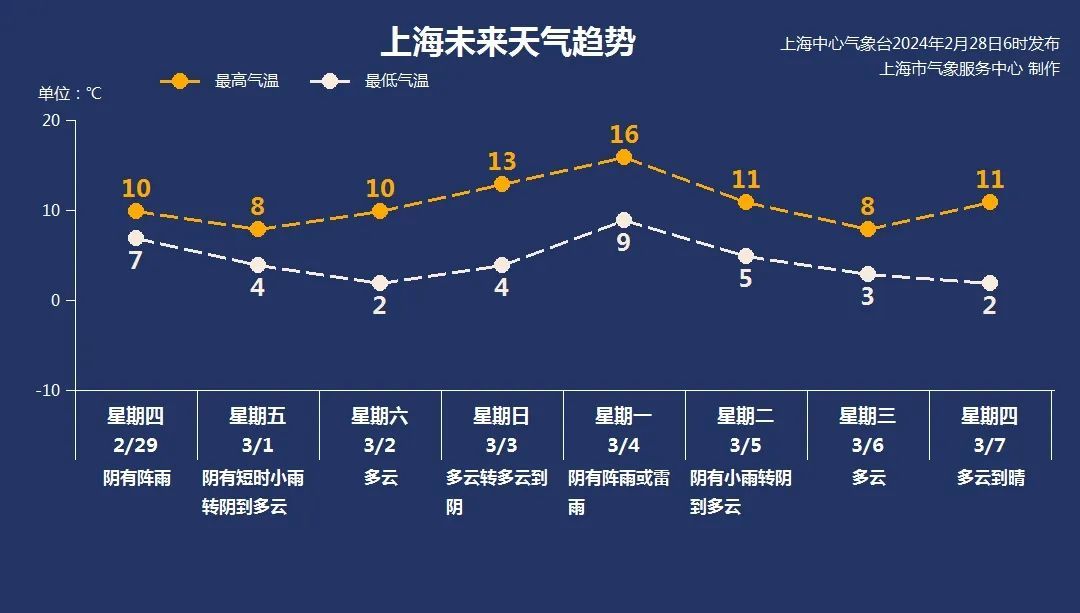 上海中心气象台预计,明后两天申城仍以阴雨天气为主旋律,但气温将保持平稳,29日全天7~10℃。3月1日雨水渐止,在冷空气影响下,最低气温在4℃左右,最高气温在8℃附近。