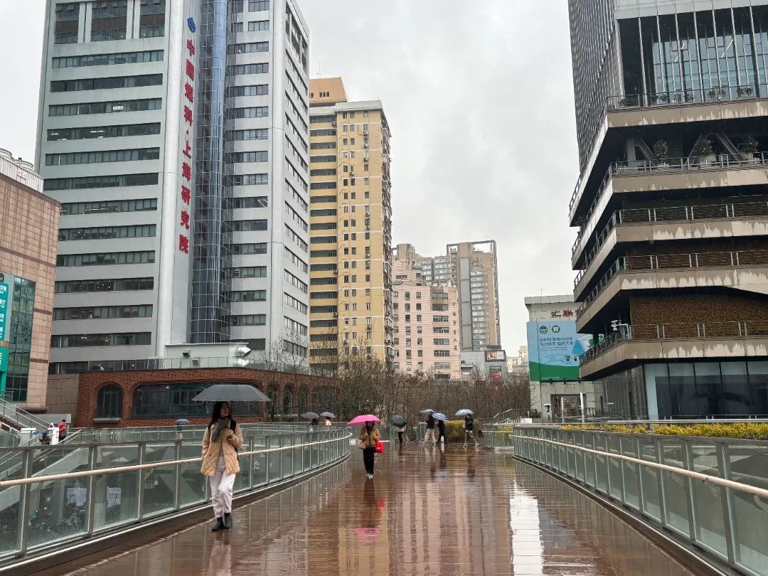 在偏东气流影响下,今日的申城再度浸泡在雨水之中。连绵的雨雾笼罩在申城上空,平日热闹的徐家汇商圈今天也显得有些冷清,撑着雨伞埋头赶路成为了行人的“标配”。行道旁的花卉、树木枝条都挂满了雨水,路面也被雨水完全打湿。
