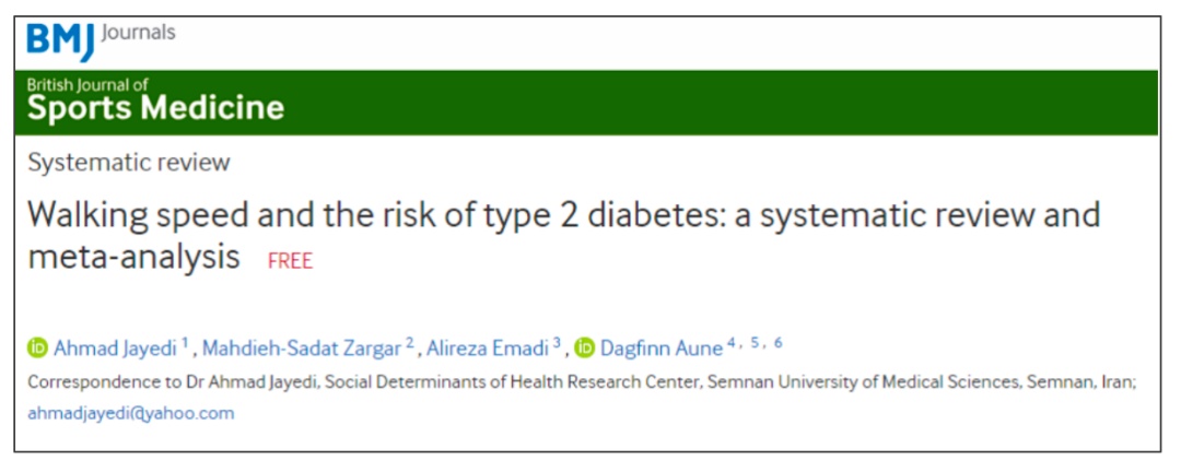 2023年发表于《英国运动医学杂志》上的一篇研究指出,只要走路的步速够快,那么患糖尿病的风险就会降低。其中,与休闲散步(<3千米/小时)相比,非常快步行(>6.5千米/小时)与糖尿病风险降低39%相关。