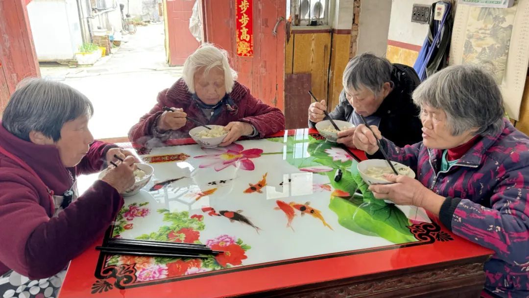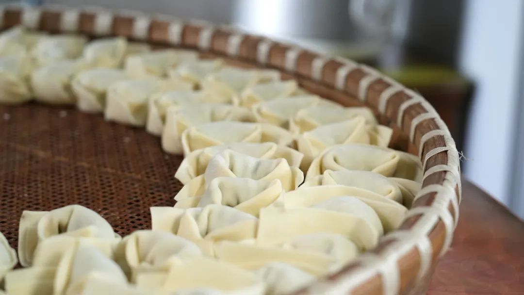 程阿婆还招呼村里两三位老姐妹一起,大家围着小方桌包起了馄饨。不一会儿,白白胖胖的荠菜馄饨像金元宝一样,整齐地摆放在竹筛上。