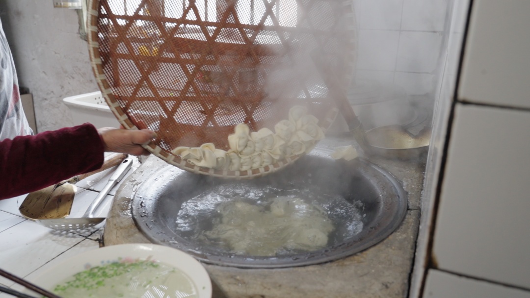 三五分钟后,馄饨便可出锅了。掀开锅盖,热气蒸腾而出,馄饨的香气扑面而来。“来来来,大家来吃馄饨!”程阿婆一边说,一边在汤碗内放入盐、香葱以及一大勺猪油,再舀一勺开水,简单美味的馄饨汤底就完成了。