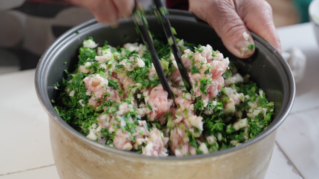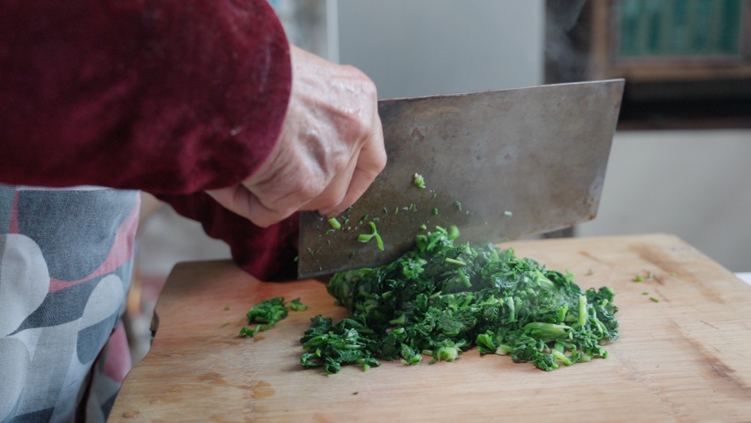 抖落泥土、摘掉老叶,冲洗荠菜,程阿婆三两下就将荠菜处理好:“我们乡下俗话说‘鱼香肉香不如野菜根香’,稍微保留一些野菜根,馄饨馅的味道会更好。”程阿婆边搅动锅中荠菜,边将乡下老底子的习惯娓娓道来。