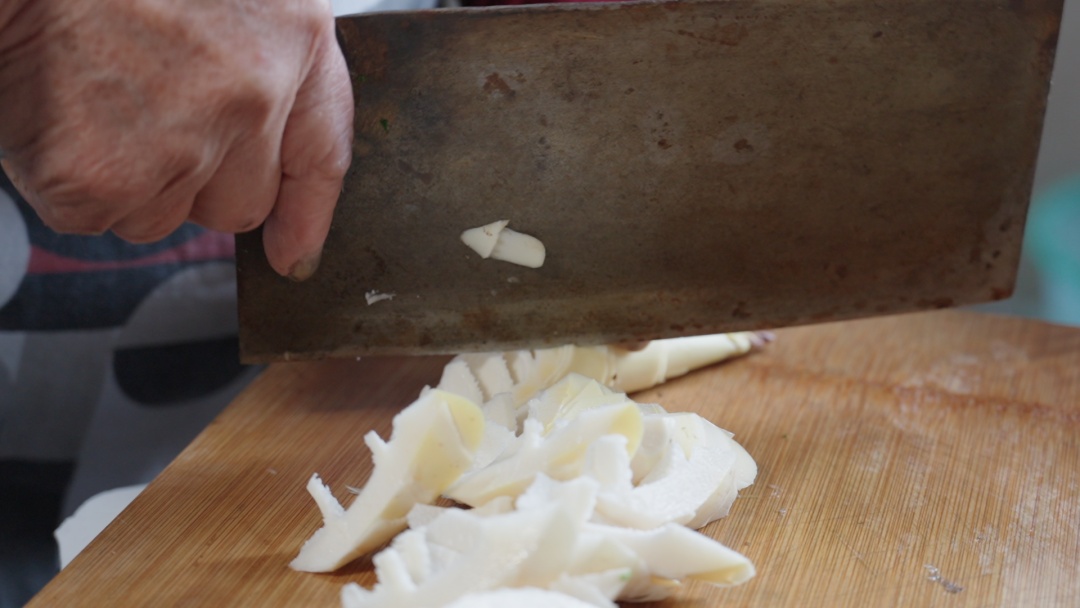 趁着烧馄饨的功夫,程阿婆也没闲着,两颗春笋去壳切成三角块放在一旁备用,稍后做成油焖笋,也是一道“鲜掉眉毛”的春菜。“这几天的春笋鲜嫩,还有节节高的寓意。”程阿婆说。