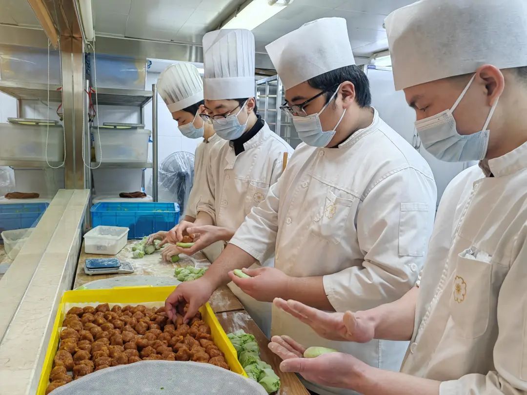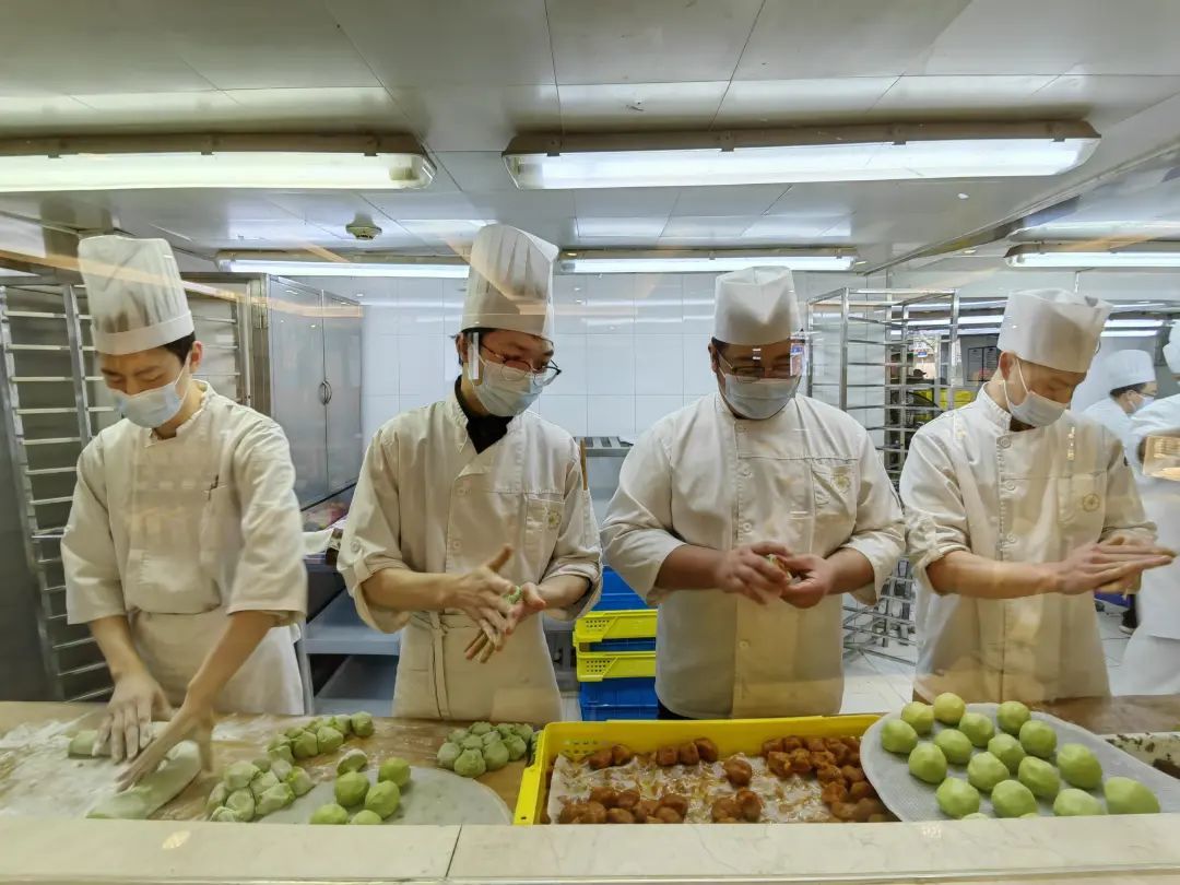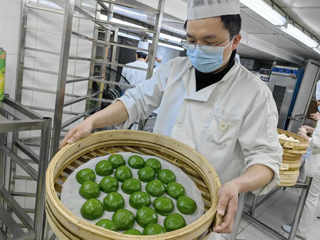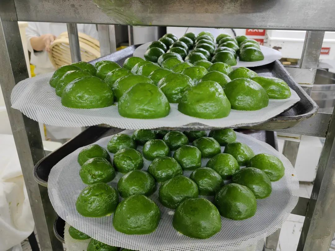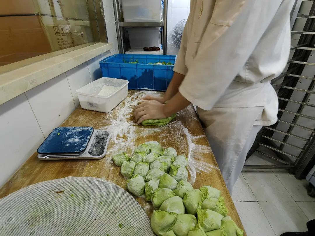 店内,点心部师傅们正在熟练地包着青团。将新鲜的麦青汁和入面皮中,反复和面,直到面皮拉力、黏性呈比例完美,才可以成为合格的面团。