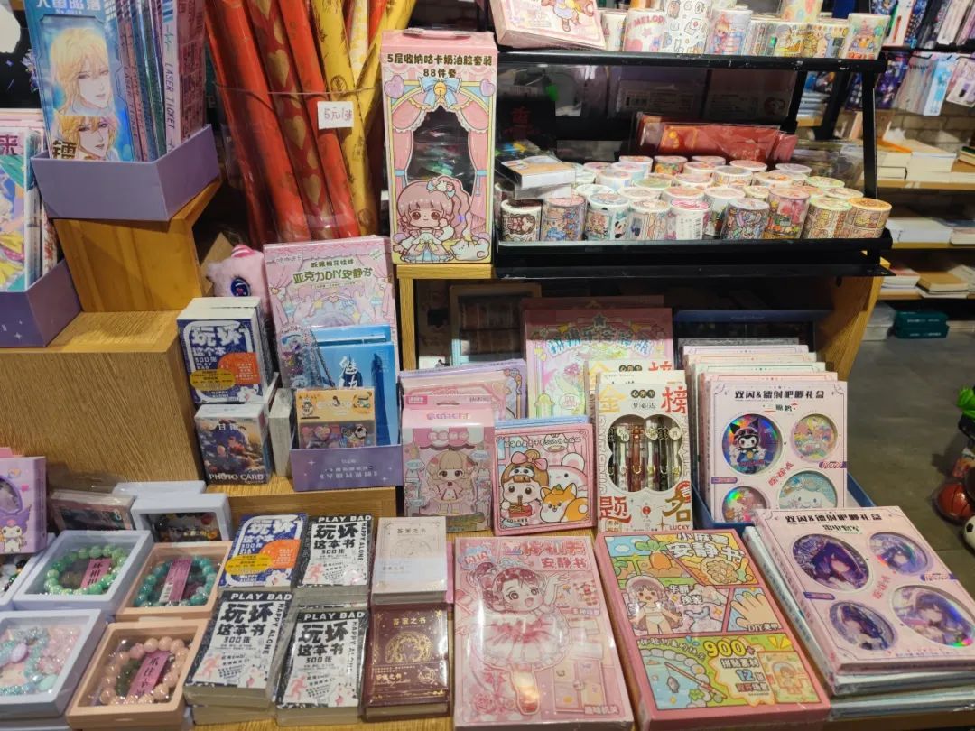 “他们放学后会到这个柜台,买各种徽章”,记者顺着店员的视线看到了一个“二次元”气息浓重的柜台,台上放置的是米哈游游戏的文创周边。其中,《原神》占大半壁江山,《崩坏:星穹轨道》和《未定事件簿》也不甘示弱,产品种类包括徽章、立牌、玩偶等。