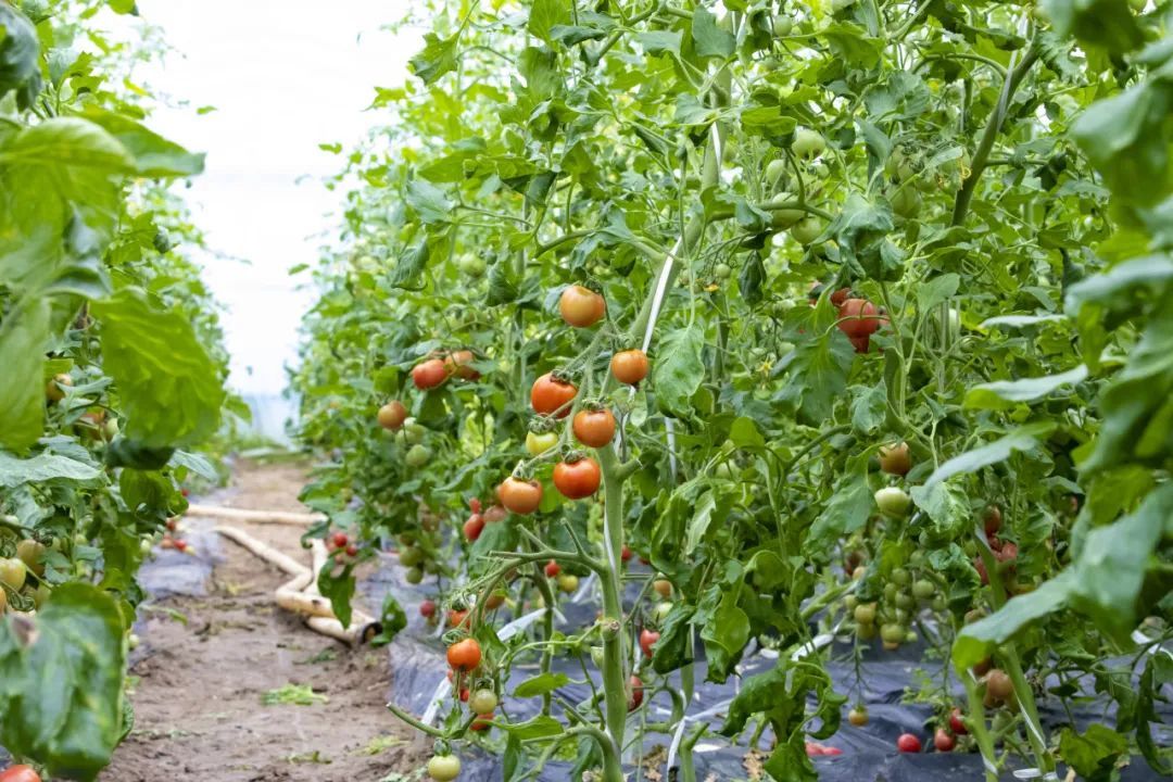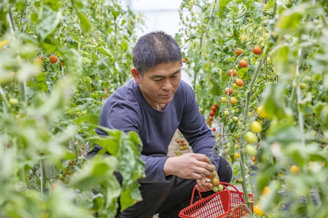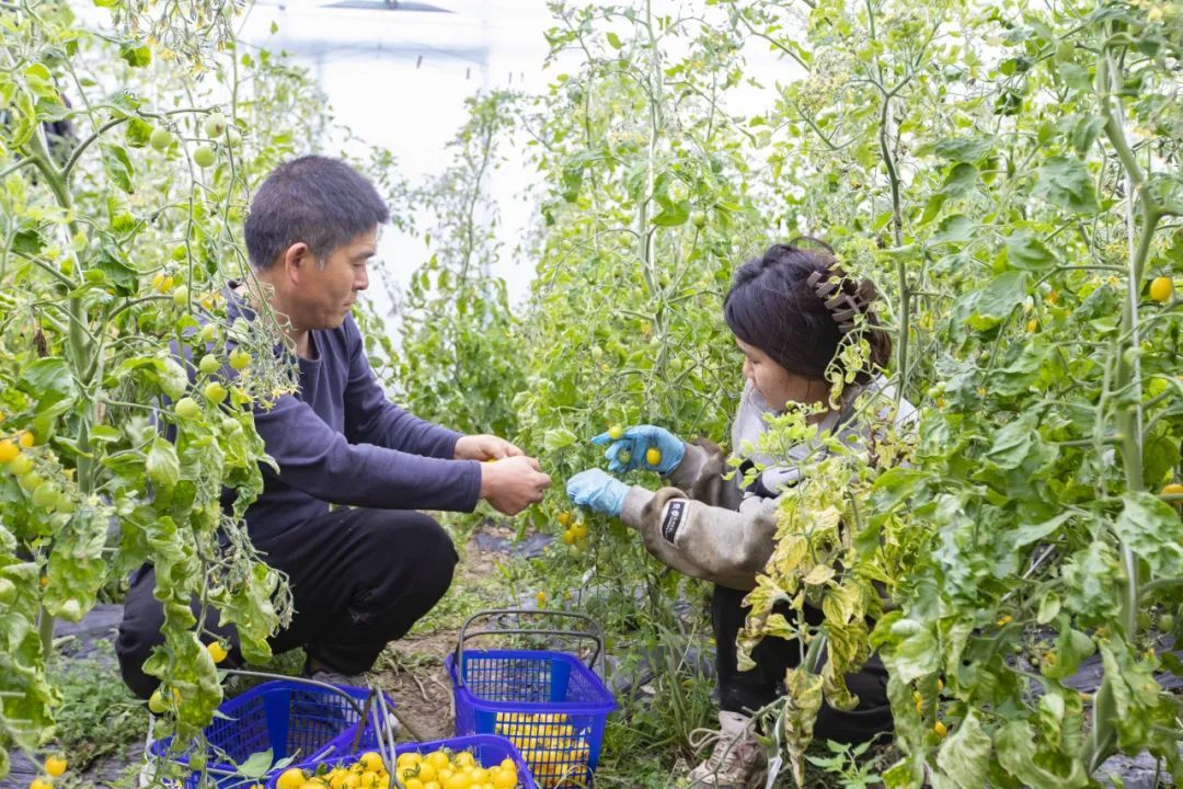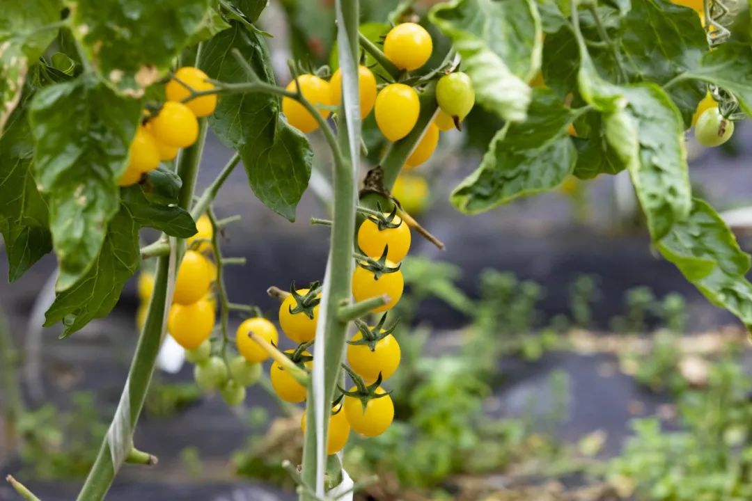 颜色各异的小番茄正蓬勃成长,品种有龙珠、皇妃、青霞、白美人等,工作人员穿梭在藤蔓间,熟练地采摘成熟的小番茄,大棚内一派繁忙景象。
