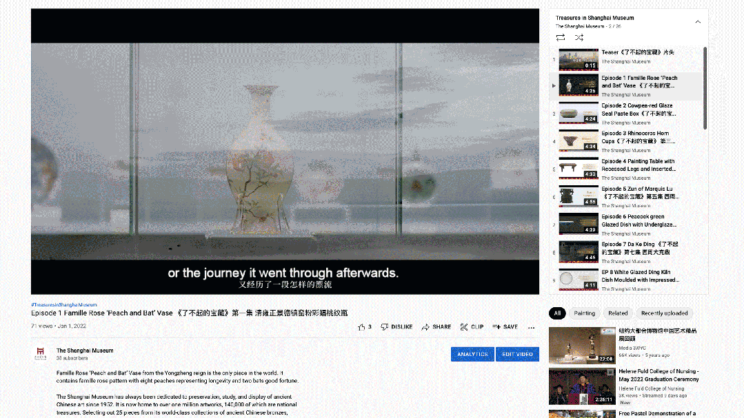 为扩大中华文化影响力,弘扬中华优秀传统文化,向世界展示中华文明之精粹,上海博物馆在2022 -2023年精心打造上海博物馆馆藏系列推广片中英文版,包括《了不起的宝藏·探宝上博》第一季、第二季,《上博的至宝》《上博匠心》,并已全面推出《了不起的宝藏·探宝上博》第一季及《上博匠心》中英文版。该系列视频凸显了博大精深中华文化的延续性、包容性,为人们的美好生活奉上视听飨宴。