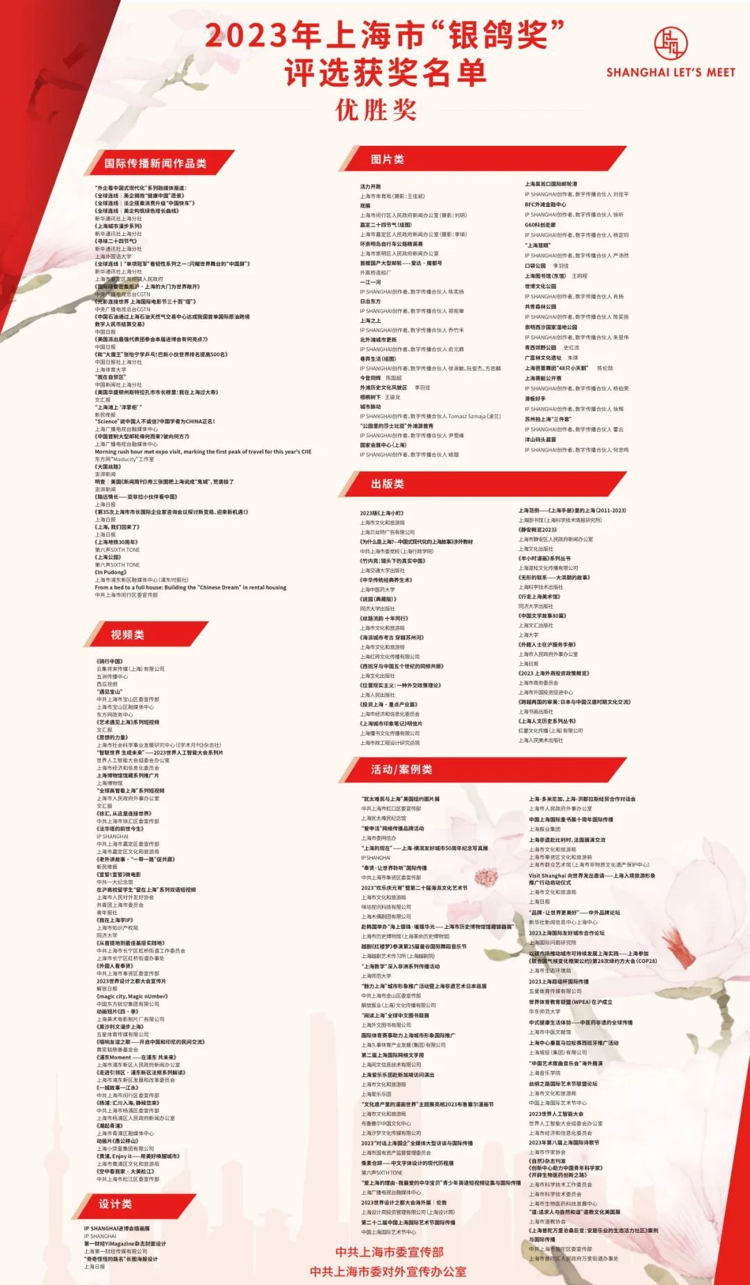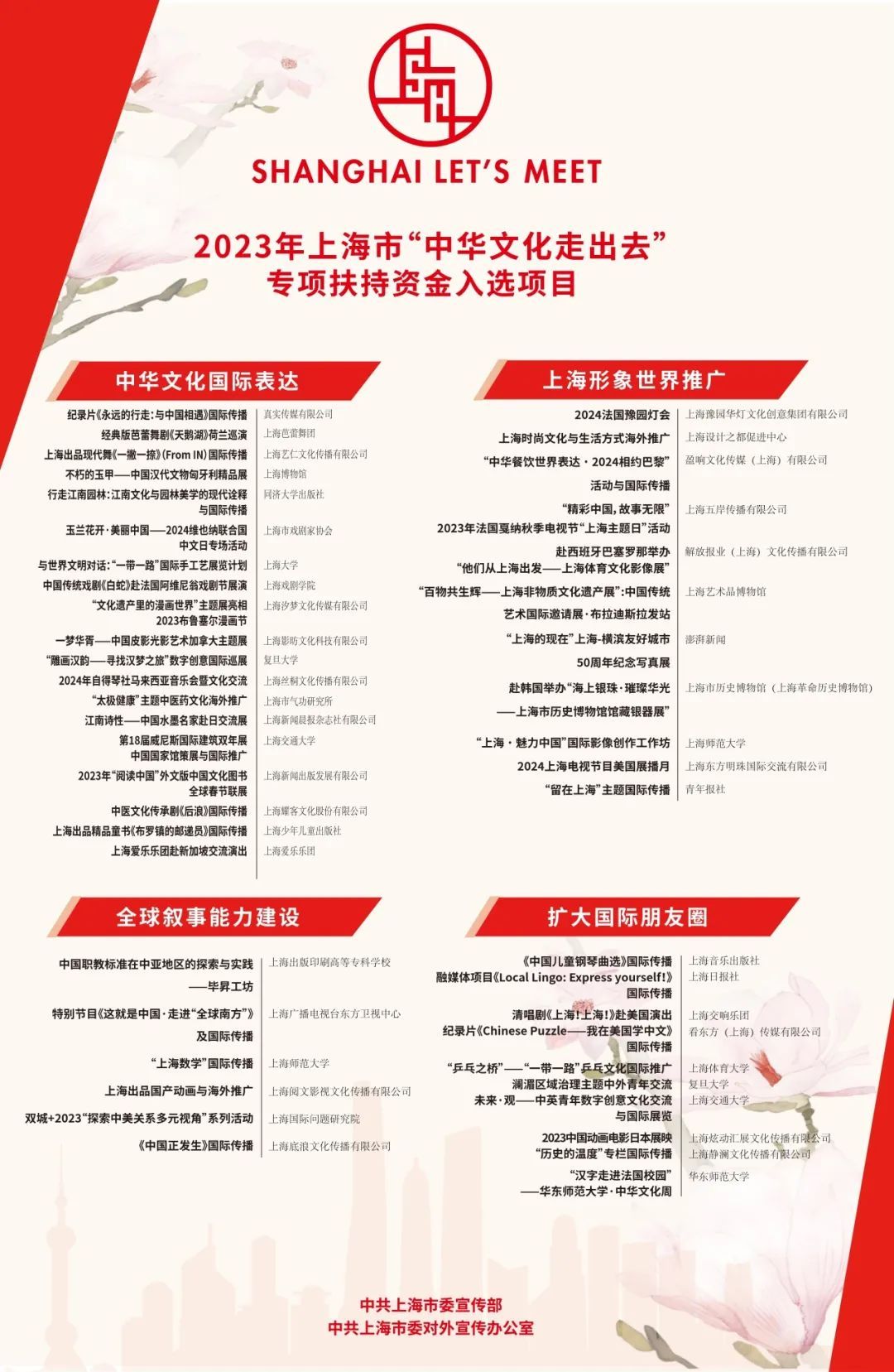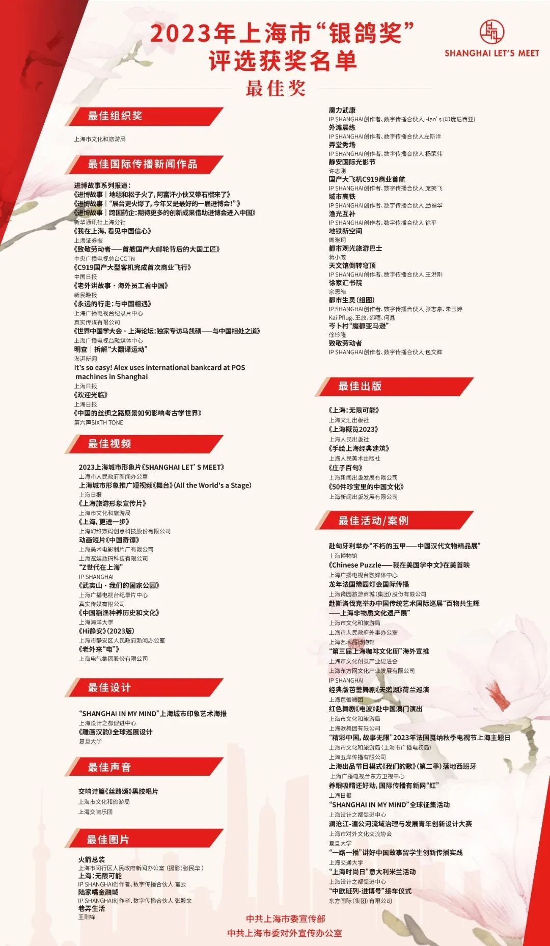 附:2023年上海市“中华文化走出去”专项扶持资金入选项目及2023年上海市“银鸽奖”评选获奖名单(上下滑动查看更多)