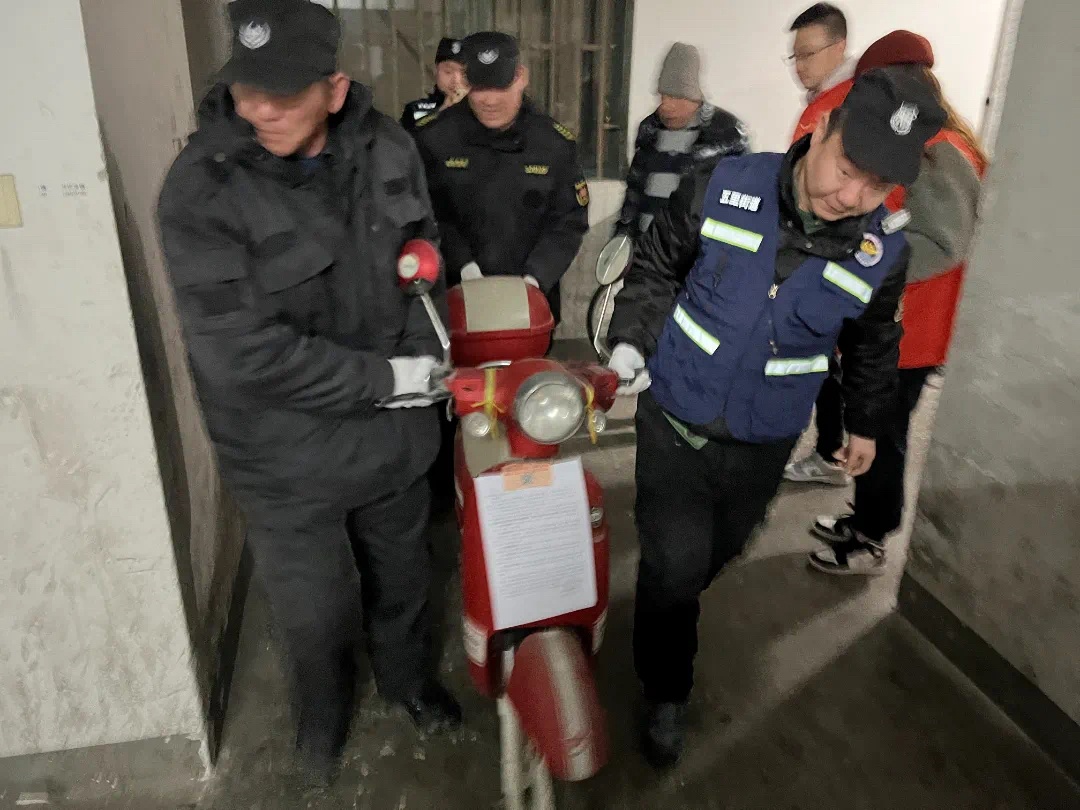 除了张阿姨居住的小区,五里桥派出所会同街道和消防部门,在辖区全面开展电动车隐患专项整治行动,召集各物业管理单位开展“电瓶车消防安全管理会议”,要求物业履行消防安全主体责任,加强小区电动车安全管理,保障居民群众生命财产安全。同时,辖区19名社区民警联合消防部门和街道平安志愿者,通过进楼入户的方式,对电动车占用消防通道、电动车上楼、乱接电线充电等隐患当即予以整改,引导居民规范电动车停放,提高居民安全意识,行动共整治清理电动车130多辆。