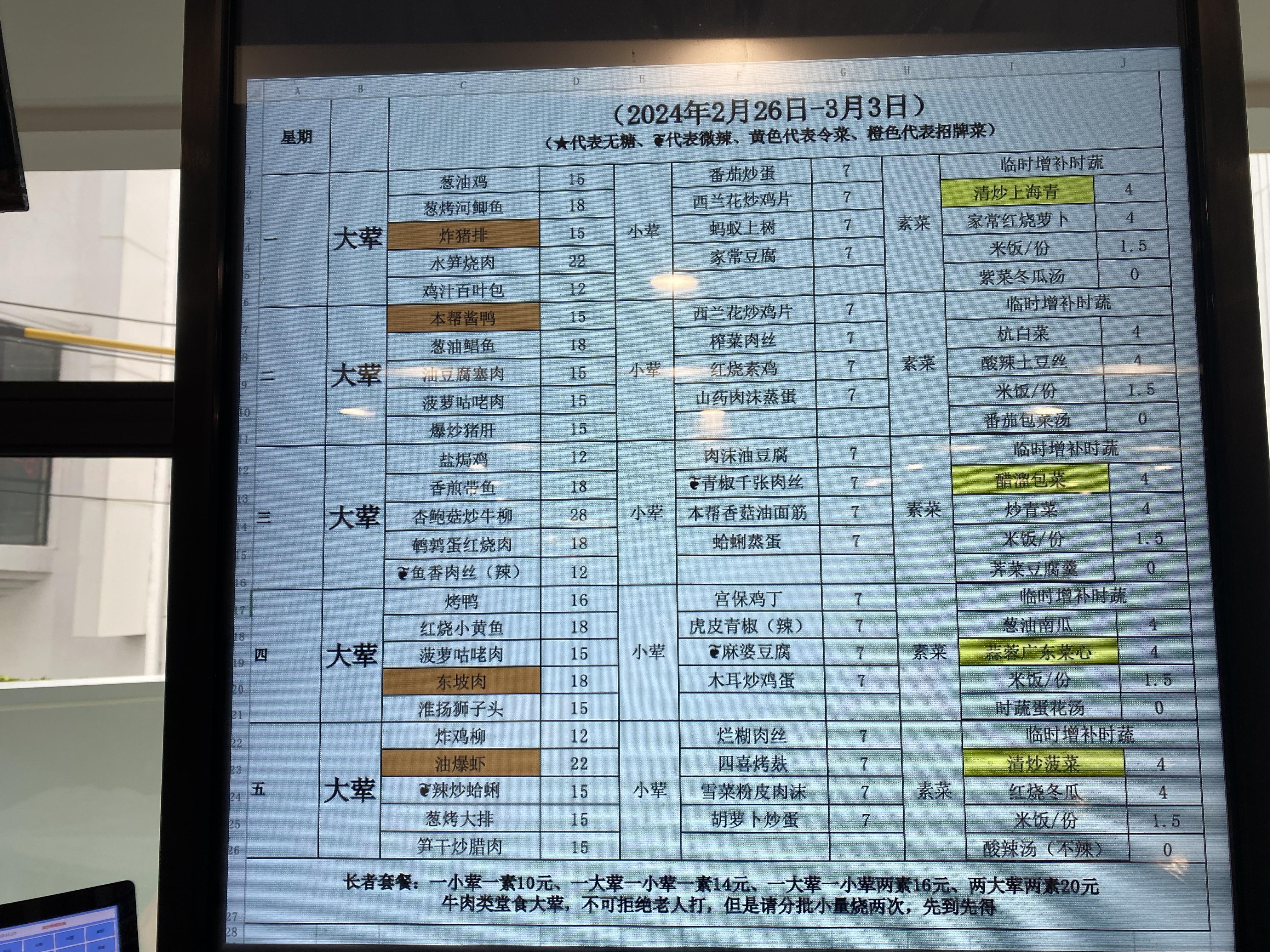 记者看到,最新一周的菜单(2月26日—3月3日)上,每天的大荤有5种选择,小荤有4种,素菜和汤还有5种,不光如此,每天的菜品几乎都不重复,还贴心地给无糖菜标上五角星,微辣的菜标上代表微辣的标识,涂上黄色的代表时令菜,橙色则代表是招牌菜。这么一份每周菜单,美味值、贴心值绝对可以打满分了。