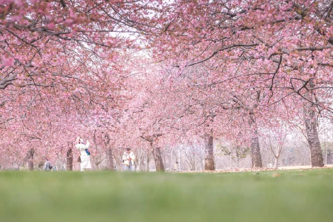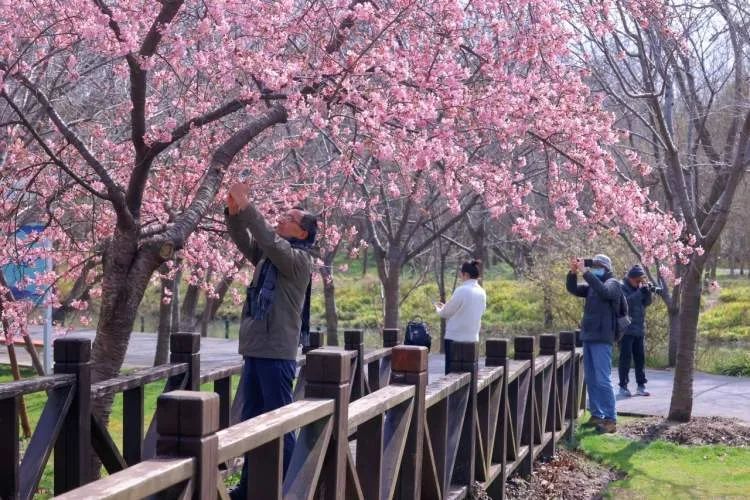 “随着天气转晴,钟花樱、河津樱这个周末进入观赏期并逐步盛放;椿寒樱、大渔樱、胭脂绯预计在下周末前后进入观赏期;大面积的中樱品种染井吉野预计在3月中旬前后进入观赏期。”顾村公园绿化管理负责人李勇介绍。