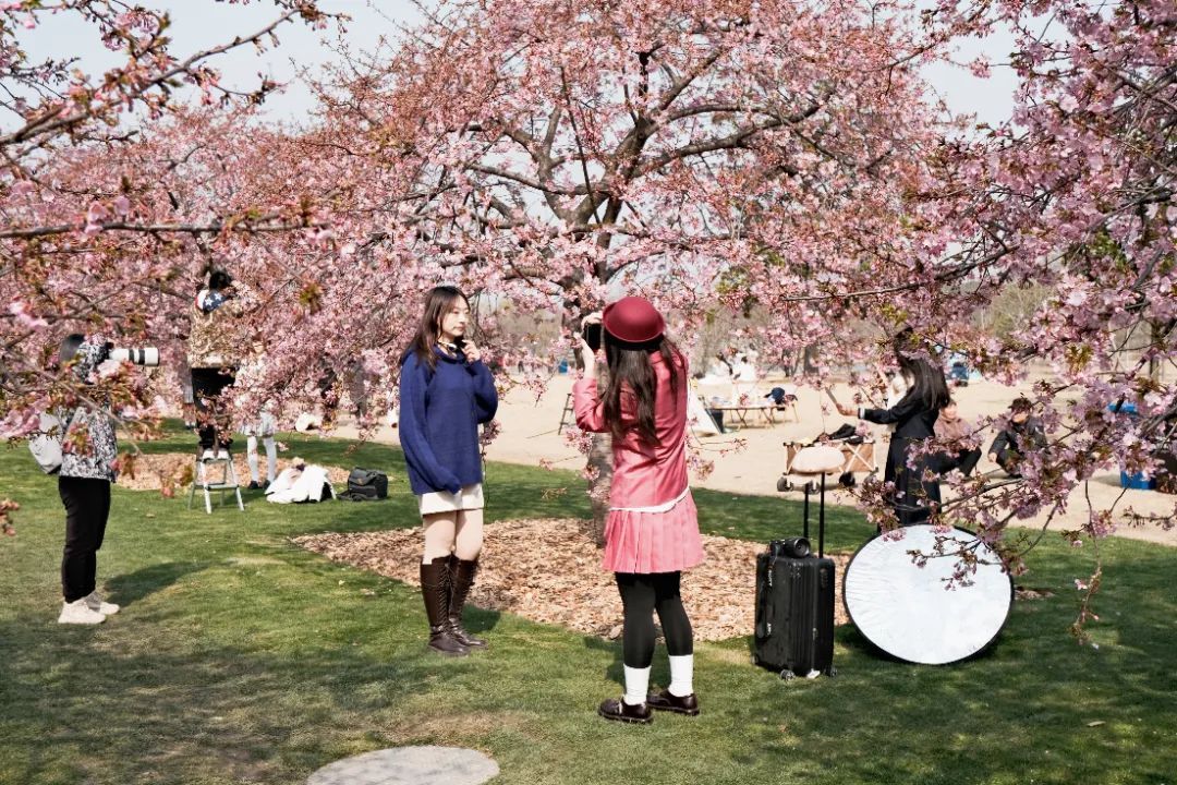 漫步樱花树下,人与花构成了春日特有的浪漫风景。游客在花海中徜徉穿梭,尽情拍照、打卡。有的自带摄影团队,踩着梯子同樱花合影;有的穿着汉服,额间花钿艳丽,还原得有模有样。盛放的樱花树下,孩子们撒欢奔跑,大人们赏花散步,一派生机勃勃的景象。