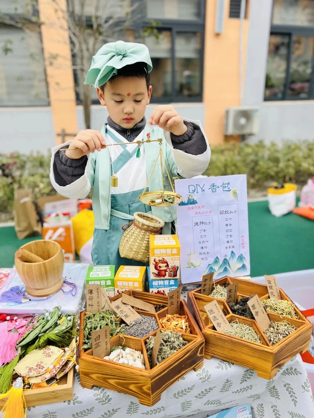 “老北门”站点,三1班班主任裘文瑜带领孩子们打造了一个“童心涵春阁”,基于上学期在老字号童涵春堂的研学经验,同学们在义卖摊位上再现了一只“百眼橱中药柜”,还自制香袋香囊、手写书签摇扇用于义卖。