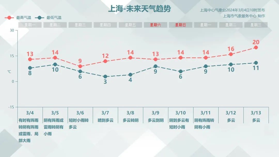 周三降水逐渐停止转为多云天气,气温进一步下降,全天气温在6~9℃之间。周四早晨最为寒冷,市区最低气温3℃,郊区跌至冰点以下。之后申城气温将整体上升,迈出走向春天的步伐。