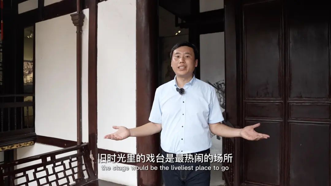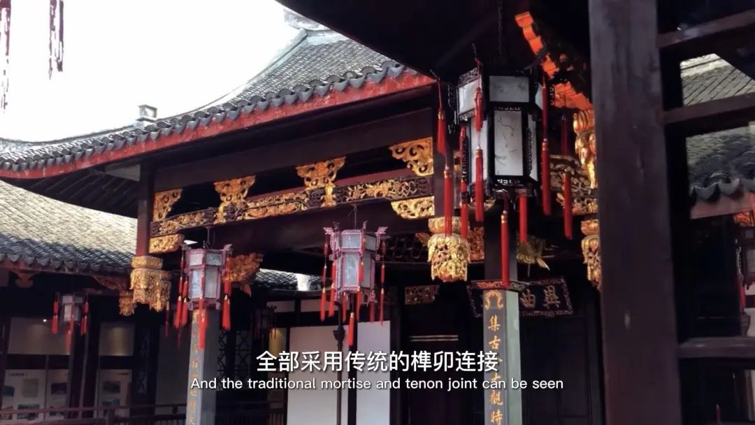 大家仔细看这戏台建筑,会发现整个古戏台都是木质结构,上面没有一个钉子,全是用传统的榫卯连接。大家抬头看,顶部是由二十二条昂拱层叠而成螺旋式盘索至莲花揭顶的穹隆式结构。自上而下看分别雕刻着百鸟朝凤、八仙吉祥、古代上海县城城墙的模型。藻井在古建筑里是权贵的象征,他一般出现在皇家宫殿、寺庙祠堂这些重要部位,有着降火消灾的寓意。这里现在也被用作非遗文化表演的重要场地,前不久非遗剧种莆仙戏也在这里拉开帷幕。