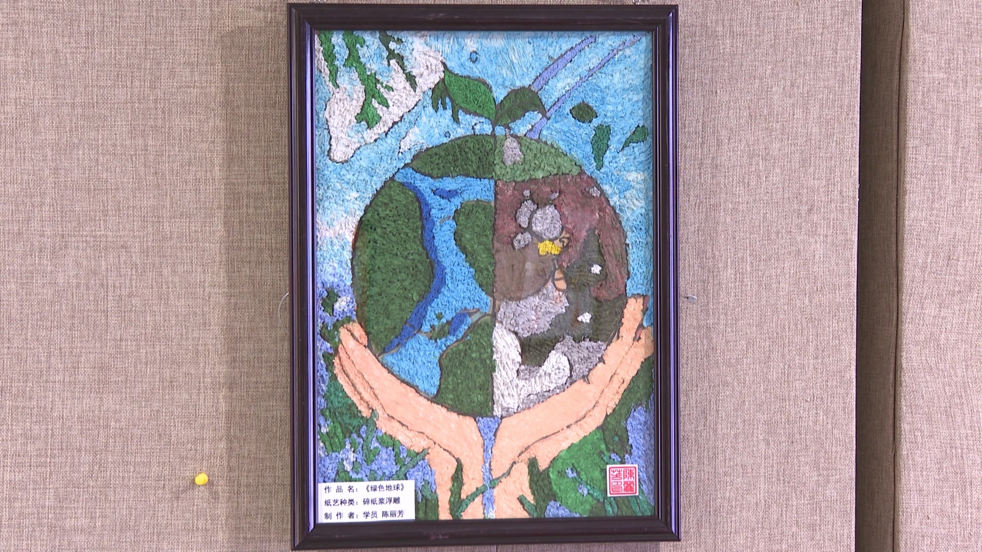 现场的作品还融入了生态环保理念。眼前这幅纸浆画,就以蓝绿、灰白不同色块,勾画出生机勃勃与资源枯竭的地球两面,画中的双手映衬着保护地球环境的主题。“我用纸浆画出两个不同状态的地球,希望用画作呼吁大家爱护地球,爱护环境。”创作者陈丽芳与记者聊起创作构思来滔滔不绝。