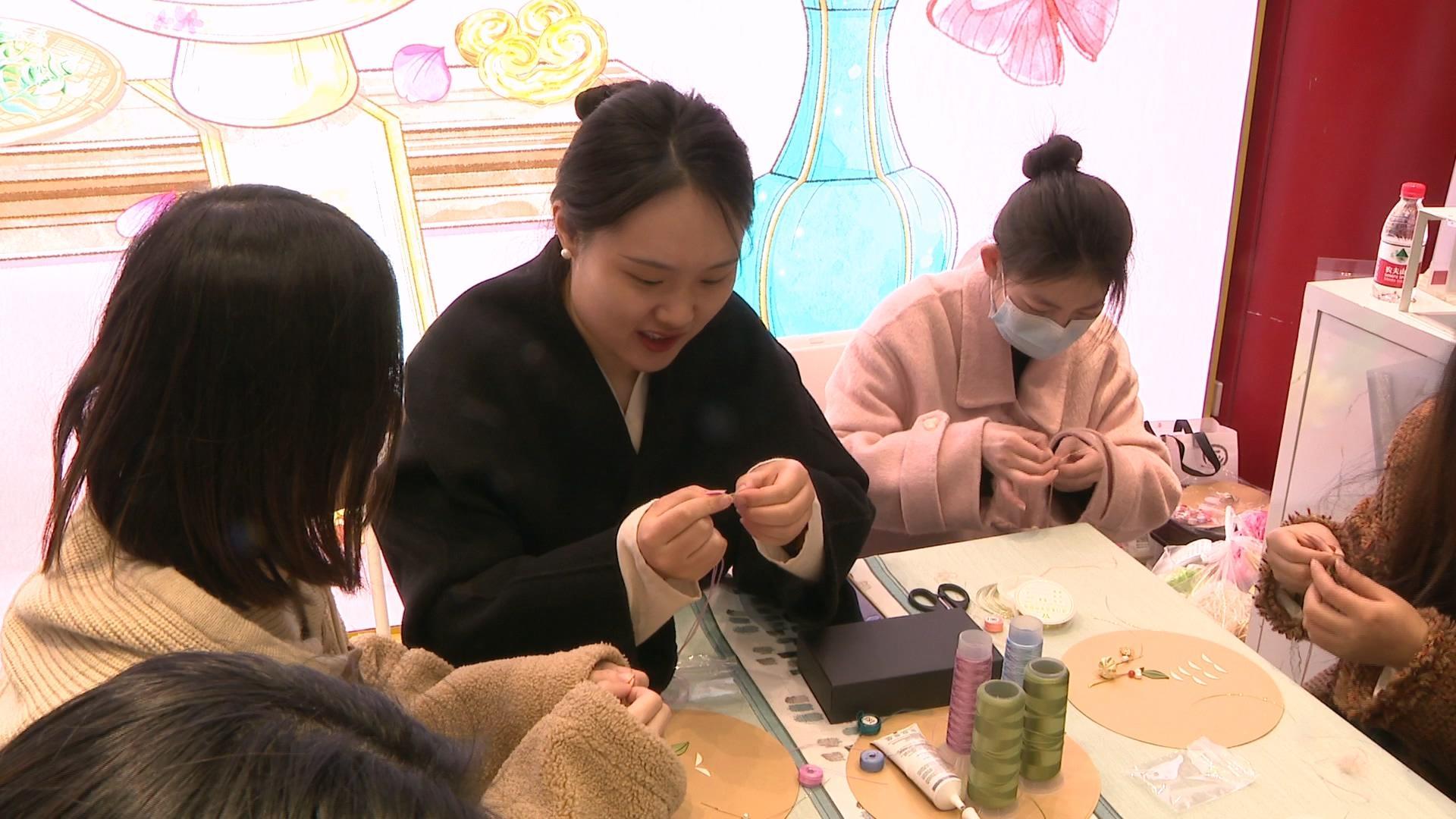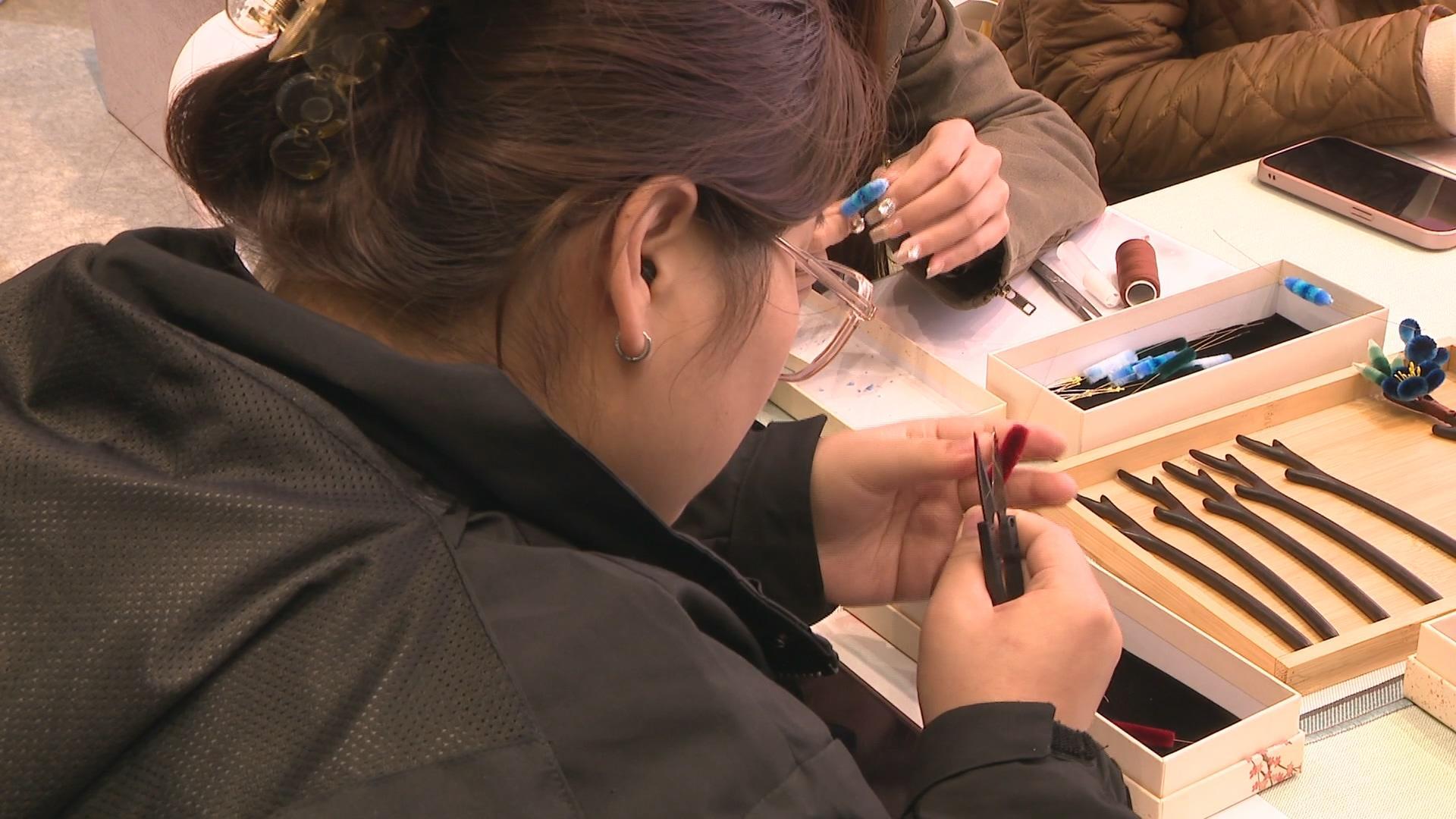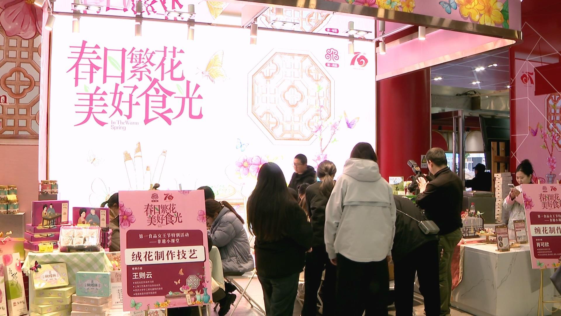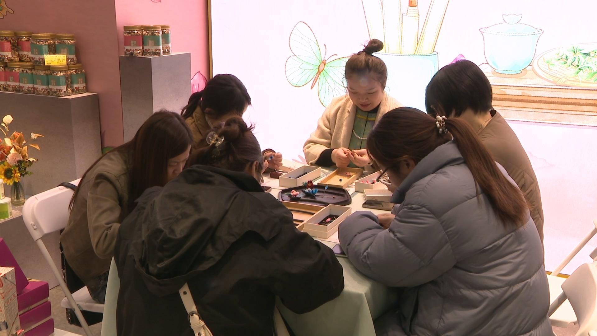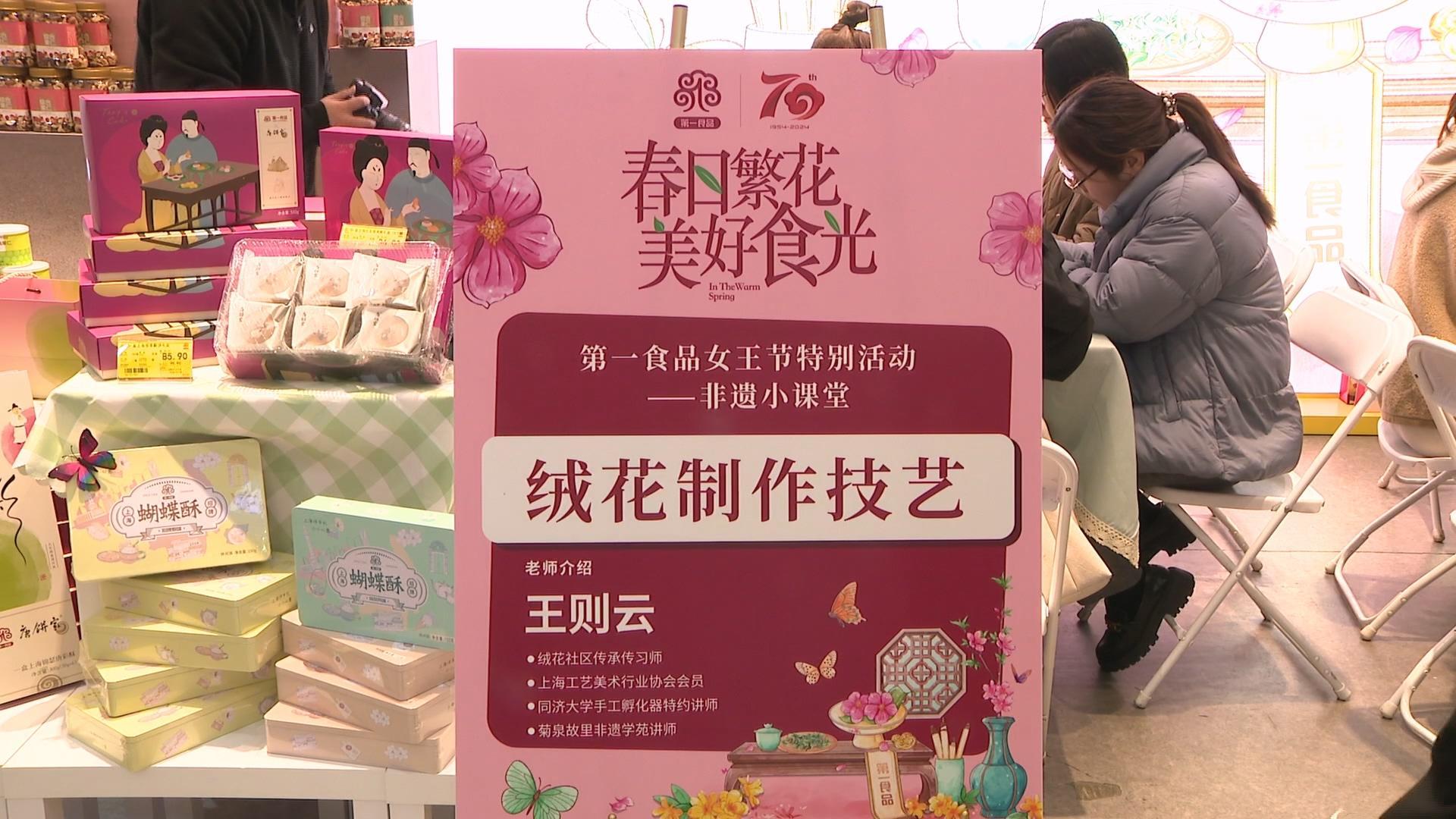 3月8日下午,位于南京路步行街上的第一食品南东店里,一场以“春日繁花 美好食光”为主题的非遗手作活动吸引了众多市民。非遗传承老师现场授课,大家纷纷化身巧手匠人,亲手制作起了绒花发簪和缠花胸针,感受传统技艺的独特魅力。