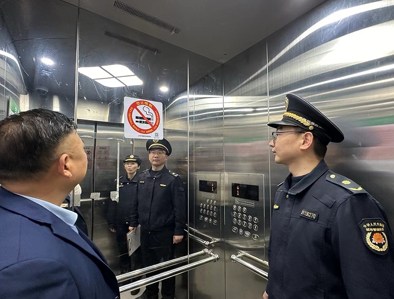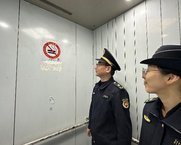 一大早,泖港镇综合执法队前往鑫乐苑小区,检查部分电梯内禁烟标志张贴情况。由于该小区分为2期,执法人员兵分二路进行核查,在检查过程中,发现一期电梯均设置统一的禁烟标识和监管电话,二期电梯由于刚刚交付,尚未设置统一的禁烟标识和监管电话,执法人员第一时间告知相关负责人并督促尽快整改完善。