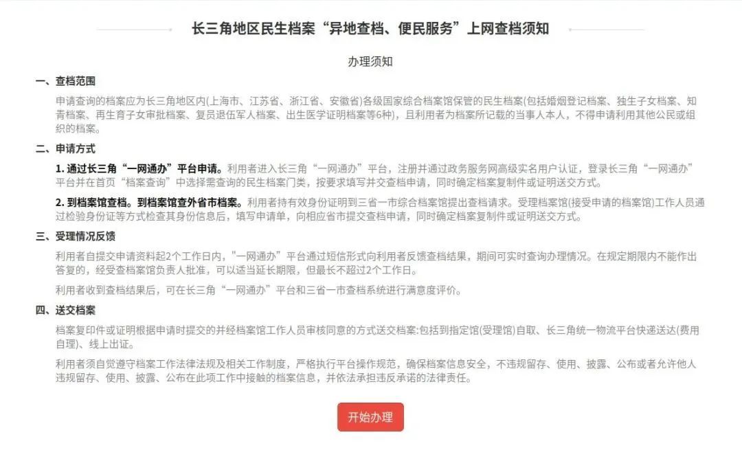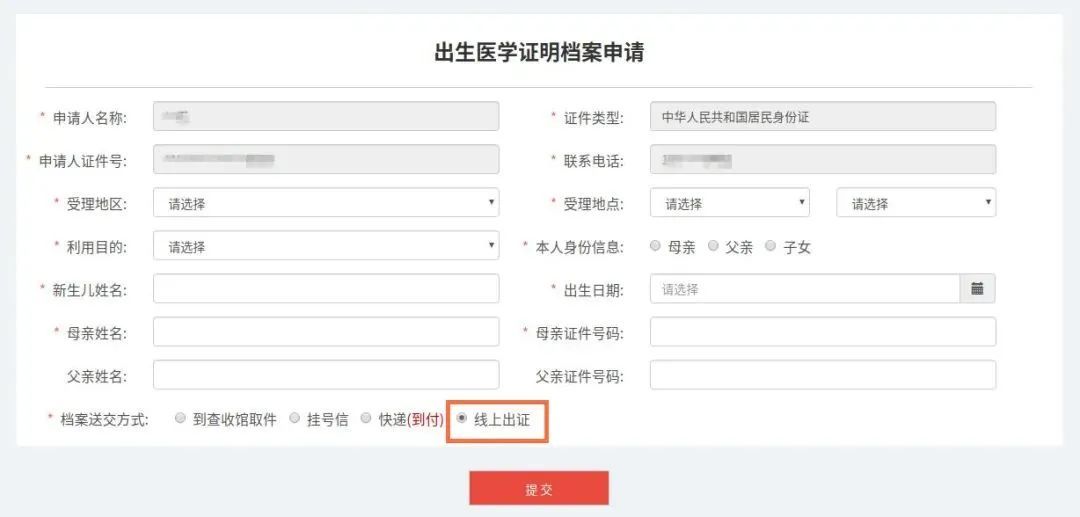 步骤六:根据提示,填写查档申请。受理地区选择档案所在地。档案送交方式选择【线上出证】