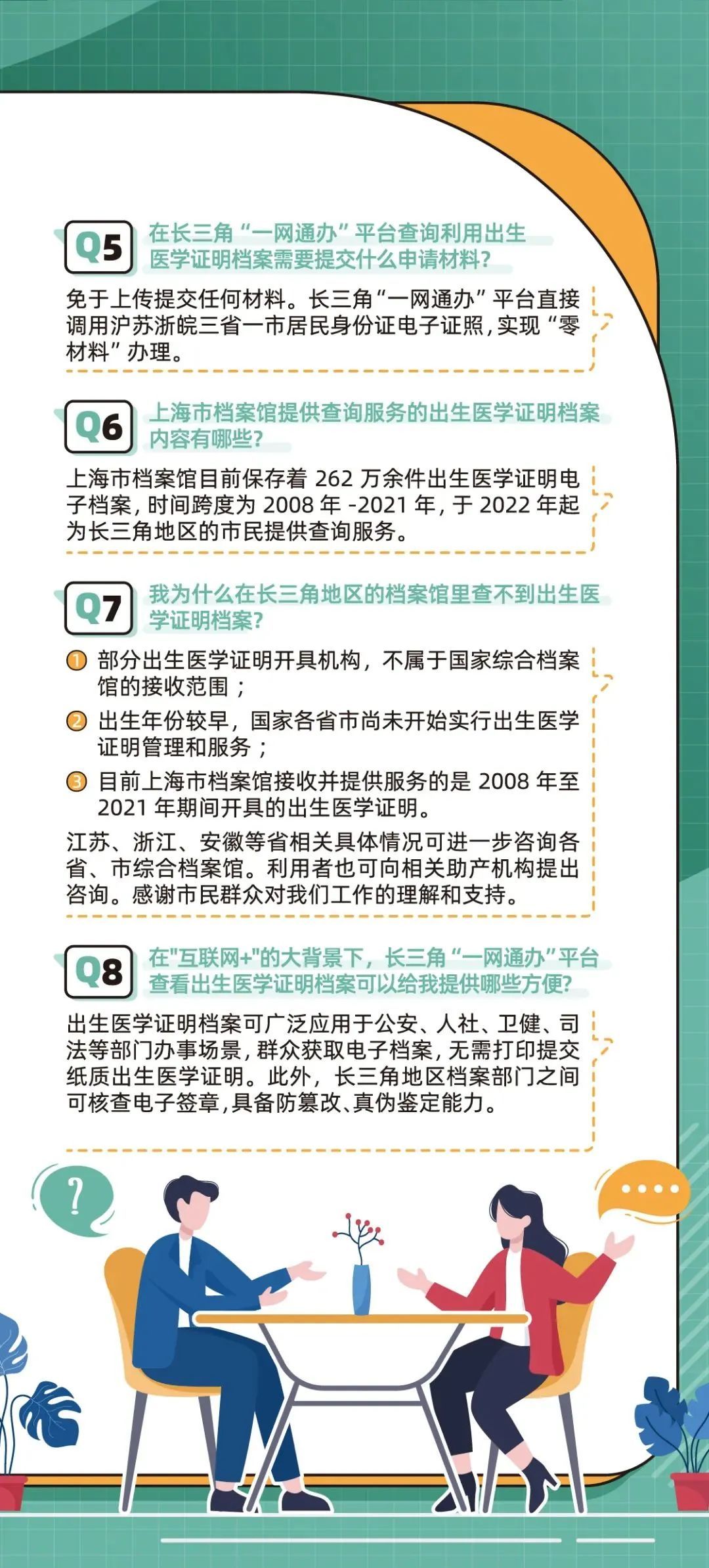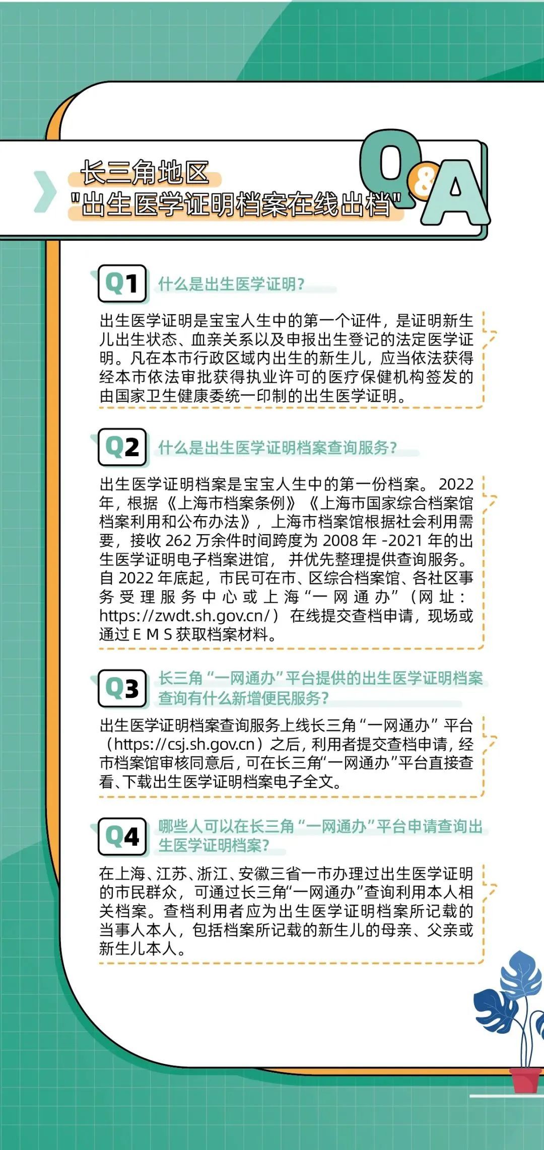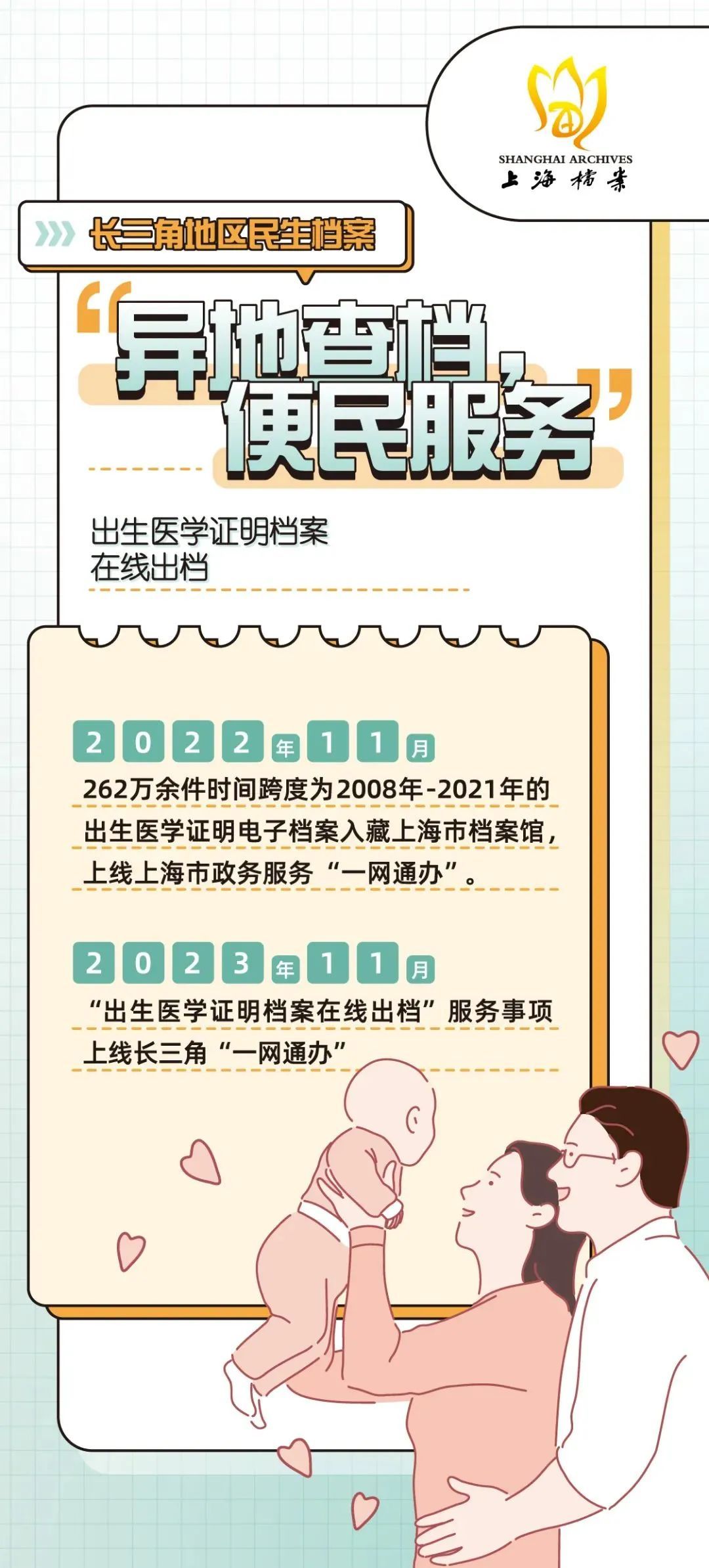 市档案局(馆)介绍,“出生医学证明档案查询”服务已上线长三角地区政务服务“一网通办”平台。这项便民服务覆盖上海、江苏、浙江、安徽三省一市的345家档案机构,长三角地区居民可通过长三角“一网通办”平台(https://csj.sh.gov.cn/govService/index)在线提出查档申请,并获取出生医学证明电子档案。其中上海可申请查询的出生医学证明档案的时间跨度为2008年~2021年。详见↓