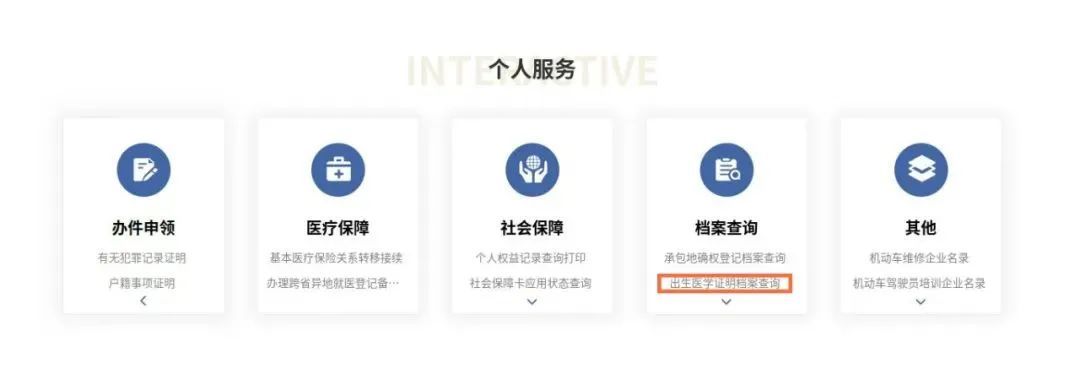 步骤二:下拉至【个人服务】栏,选择“档案查询”板块下“出生医学证明档案查询”事项