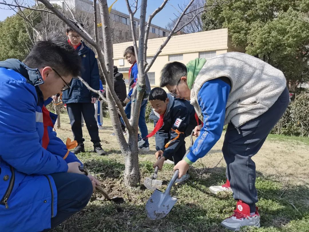 “我们先松土,种下树后把土围得高一些,这样浇水后就不容易倒。”活动现场,学生们在老师的指导下开始动手铲土,准备为2棵樱花树“安家”。“我今天学到了很多种树知识,感受到爱护绿化和保护环境的重要性。我和小伙伴约定,待到樱花烂漫时,每年都来看看它们。”学生李乐辰说。
