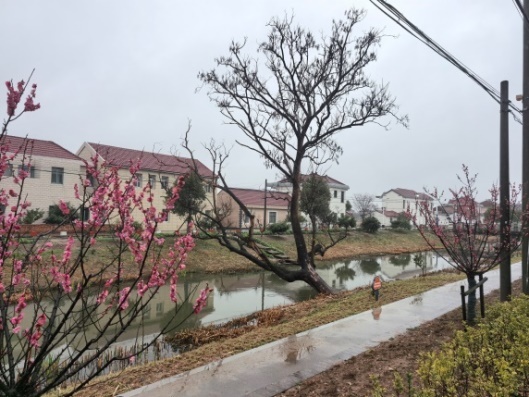 滧东村位于建设镇西北部,紧邻东平国家森林公园,依托区位优势不断做大做强民宿产业、稻米产业,盘活林地资源,以村民自治为内生力,推动农文旅融合发展,成为老百姓的 “美丽家园”“绿色田园”和“幸福乐园”,前不久获评2023年度上海市美丽乡村示范村。 村民自治 绘就“美丽家园” 沿着主干道红梅路驶入滧东村,一排红梅树映入眼帘,和风细雨中梅花悄然绽放,一簇簇傲然挺立在枝头,为乡村水墨画增添色彩。道路中间红蓝黄三色彩虹骑游线鲜艳夺目,河道旁民居错落,宅前屋后小菜园、小花园干净整洁,一幅田园乡居图,铺展眼前。 滧东村航拍图片 欣赏着眼前的田园乡居图,红梅11队的小队长施圣才颇为自豪。红梅11队是滧东村最大的一个生产队,也是首先试点村民自治“积分制”的小队,村民通过自行保持宅前屋后整洁美丽、认真做好垃圾分类、孝老爱亲等10项内容获得积分,再用积分兑换奖励,村民的积极性被激发,村容村貌得到提升,村民用实际行动宣传阐释精神文明创建活动。