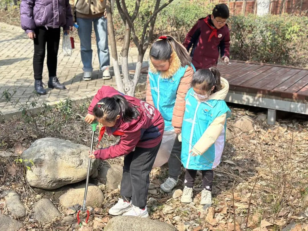植树后,孩子们依然热情高涨,随即在工作人员的带领下开展起了“绿化巡逻”,清理绿化带里的垃圾,用实际行动美化环境。