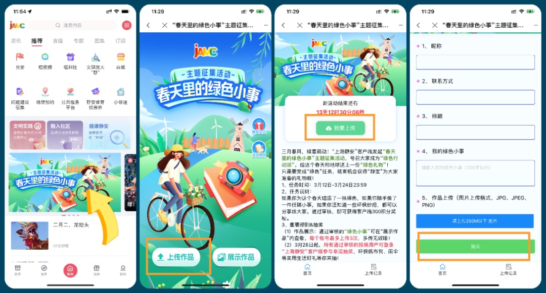 三月春风,绿意萌动! 这个“植树节”, 你为春天增添“绿色”了吗? 3月12日起,“上海静安”客户端发起“春天里的绿色小事”主题征集活动,号召大家成为“绿色行动派”,给这个春天和地球送上一份“绿色礼物”! 只需要完成“绿色”任务, 就有机会获得静宝 为大家准备的双重奖励哦! 3月12日10:00—3月24日23:59 如果你为这个春天增添了一抹绿色, 如果你随手做了一件低碳小事, 如果你还知道一些环保妙招, 都可以分享给大家。 通过审核, 即可获得客户端300积分奖励。 昵称:静宝1号 标题:自带杯拷“咖啡” 我的“绿色小事”:想喝咖啡的时候,静宝都会拿上“自带杯”,选择支持环保的商家拷咖啡,既环保又省钱,真是两全其美呢! 昵称:静宝2号 标题:拒绝塑料袋,钟爱JAMC帆布袋 我的“绿色小事”:每次去超市购物,静宝也会习惯性地带上JAMC帆布袋,拒绝使用塑料袋。保护环境不就是从这些实实在在的“绿色小事”中做起的吗? 通过审核的“绿色小事” 可在“展示作品”内查看, 每个账号最多上传3次, 多传无效哦! 3月26日起所有通过审核的投稿用户 ↓可激活“绿色”抽奖资格↓ 登录“上海静安”客户端参与幸运抽奖, 小米转化插座、环保帆布包、雨伞等 实用生活好礼等你来领!