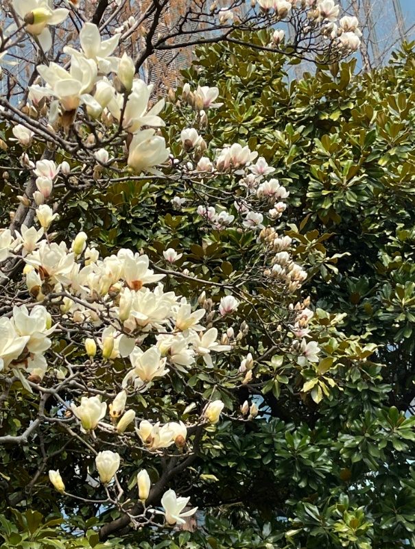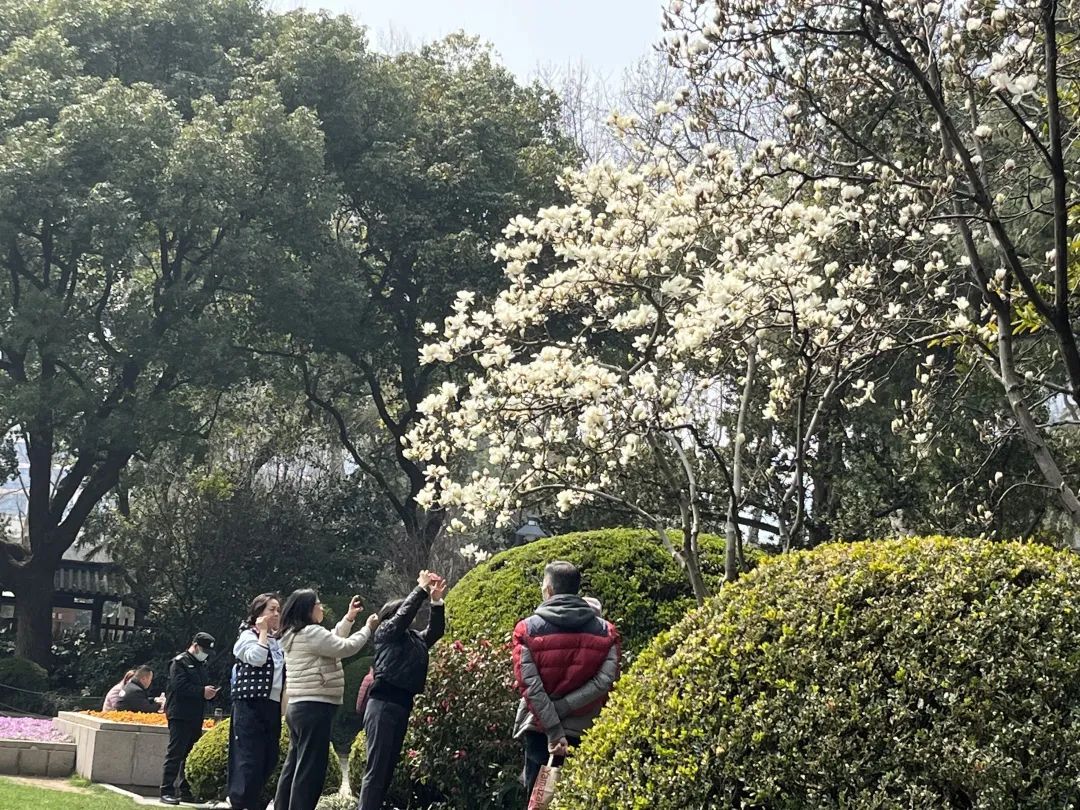 漫步于静安公园中,盛放的白玉兰在春风吹拂下仿佛无数只振翅而飞的白鸽,圣洁而浪漫。