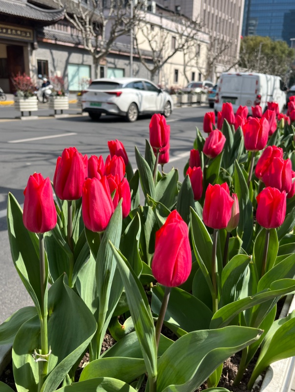 常德路沿线的花箱里,红色的郁金香也散发着春天明媚动人的气息,让人眼前一亮……