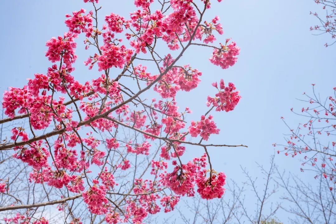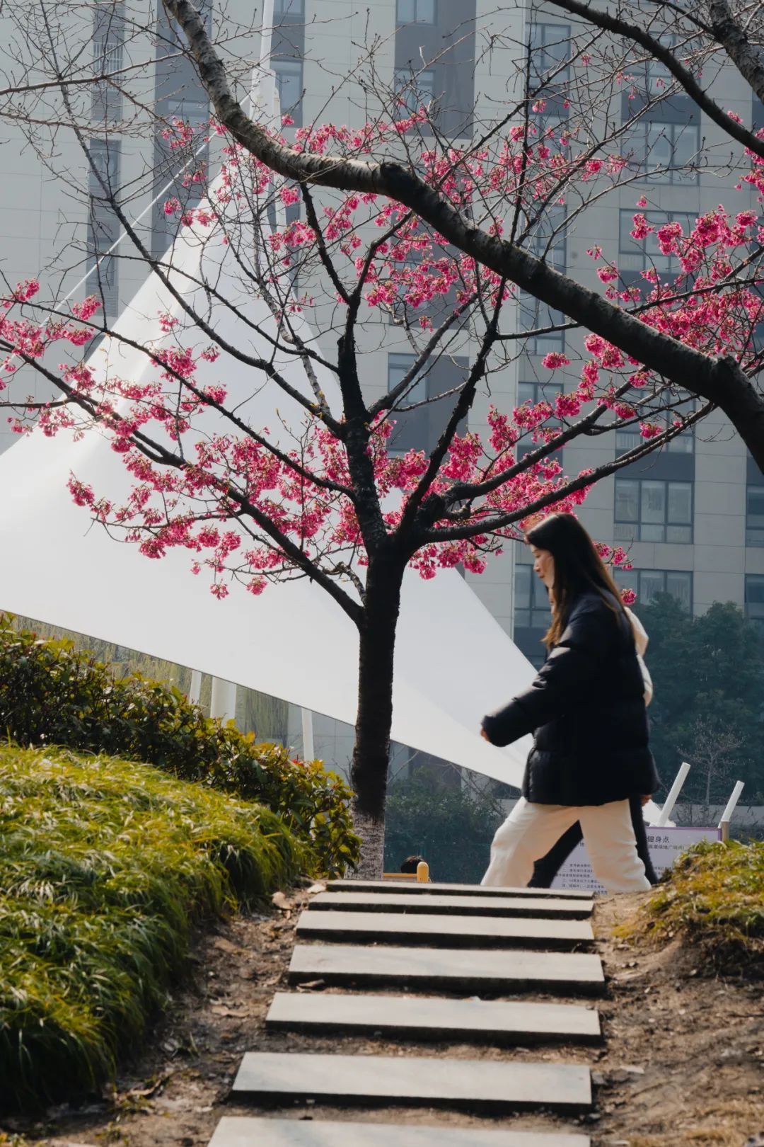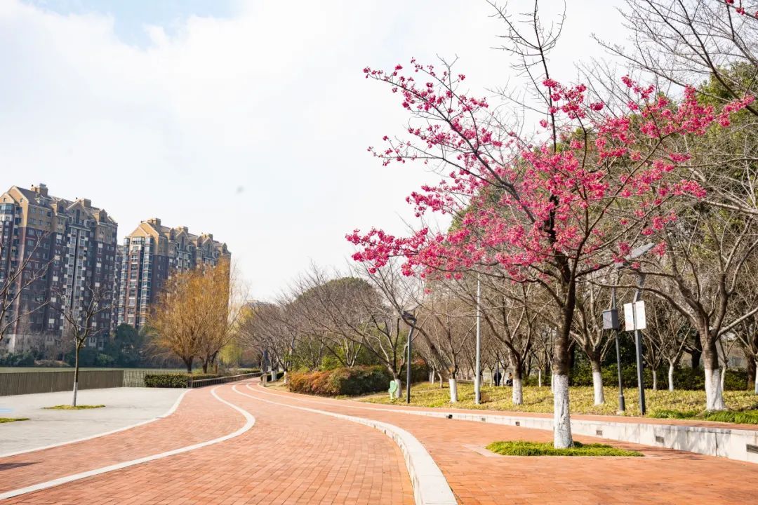 沿着健身步道往公园内部走去,临湖的步道旁钟花樱颜色格外明艳,钟花樱的花期为二月到三月,长长的花柄,三五朵花成簇悬垂,既像小铃铛,又像穿着绯色蓬蓬裙的小公主。