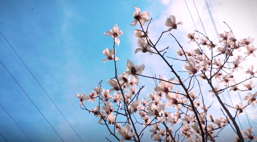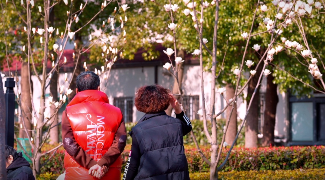 在公园靠近共康四村的秋园内,30余棵白玉兰环绕着广场亭亭玉立,朵朵如玉般皎洁的花朵立于枝头。在蓝天、白云的衬托下,每当春风轻拂,花瓣轻轻摇曳,仿佛一只只振翅高飞的白鸽,站在花树下,淡雅的香气便沁入心脾。