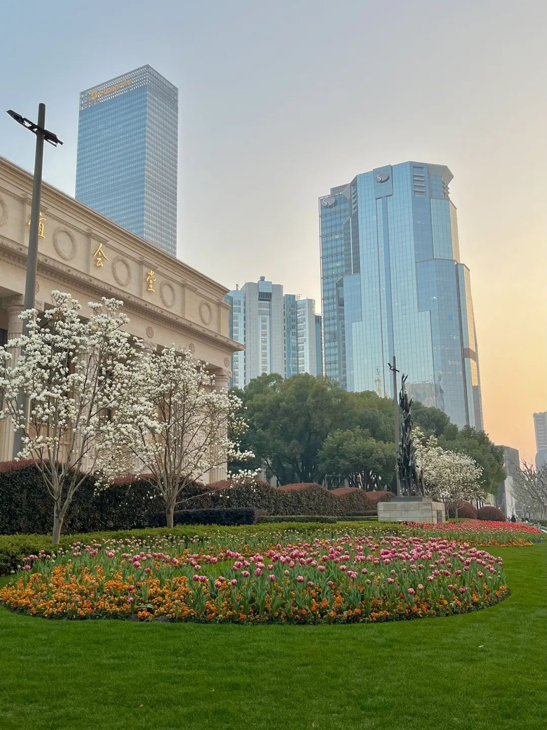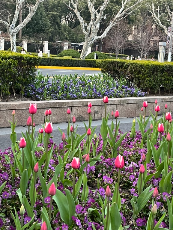 南京西路友谊会堂前,白玉兰与郁金香交相辉映,让人感受到生机勃勃的力量;