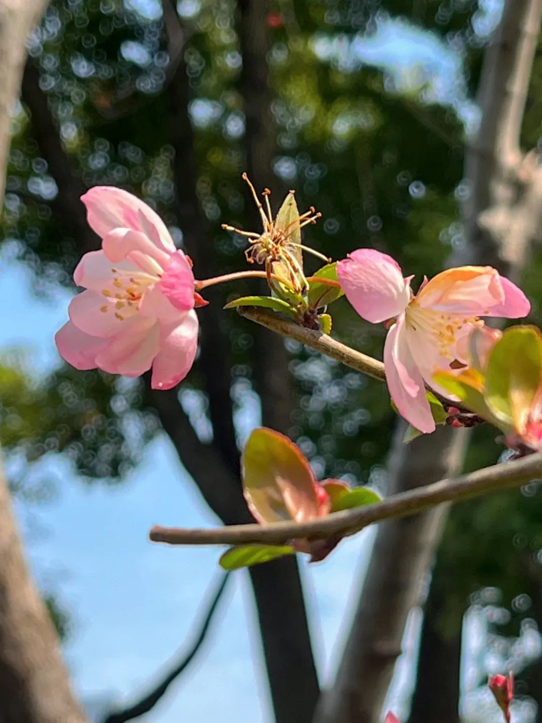车水马龙的高架下,一朵垂丝海棠的绽放悄悄预告了花期将近……