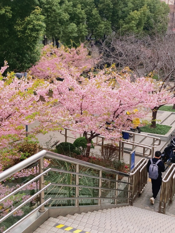从轨道交通一号线彭浦新村站3号口出站,入眼便是一排绽放的早樱,走下人行阶梯的行人纷纷被身侧盎然的春意所吸引,停下脚步定格住一瞬春光。