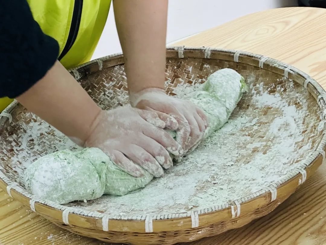 3.将煮好的芥菜捞出,倒入面粉中搓揉,再和成团。