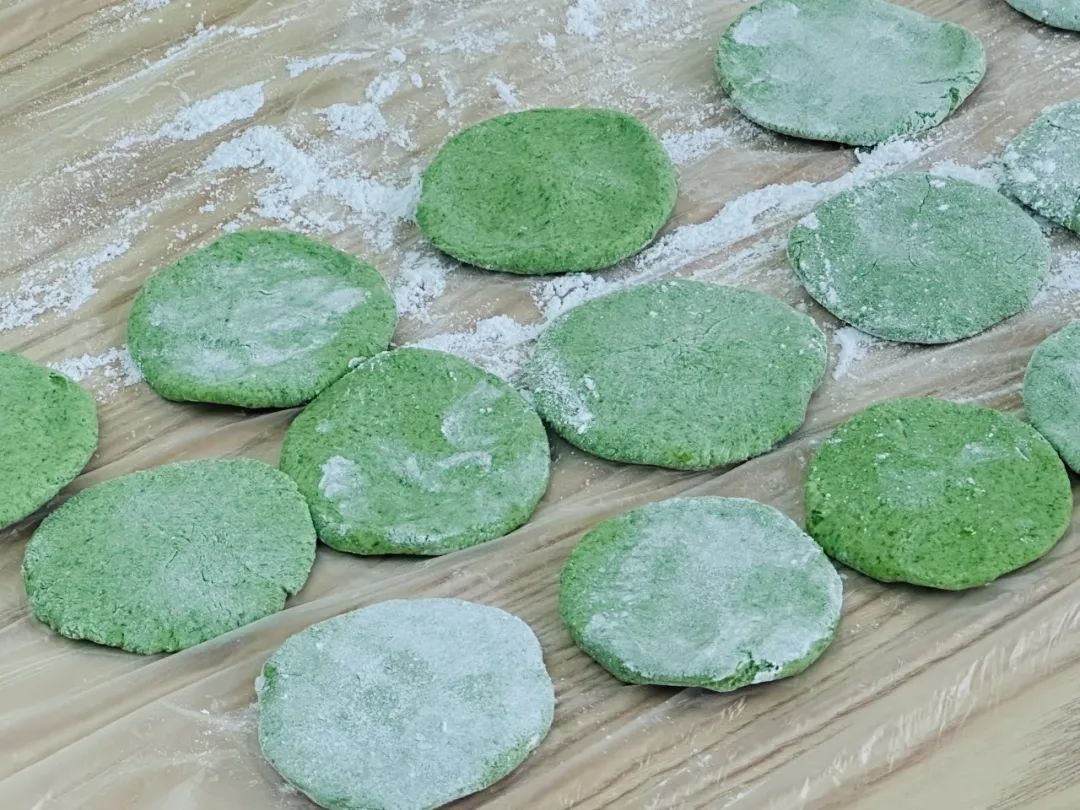 4.随后把小面团揉、捏、搓、压,一个个芥菜塌饼就初具雏形了。