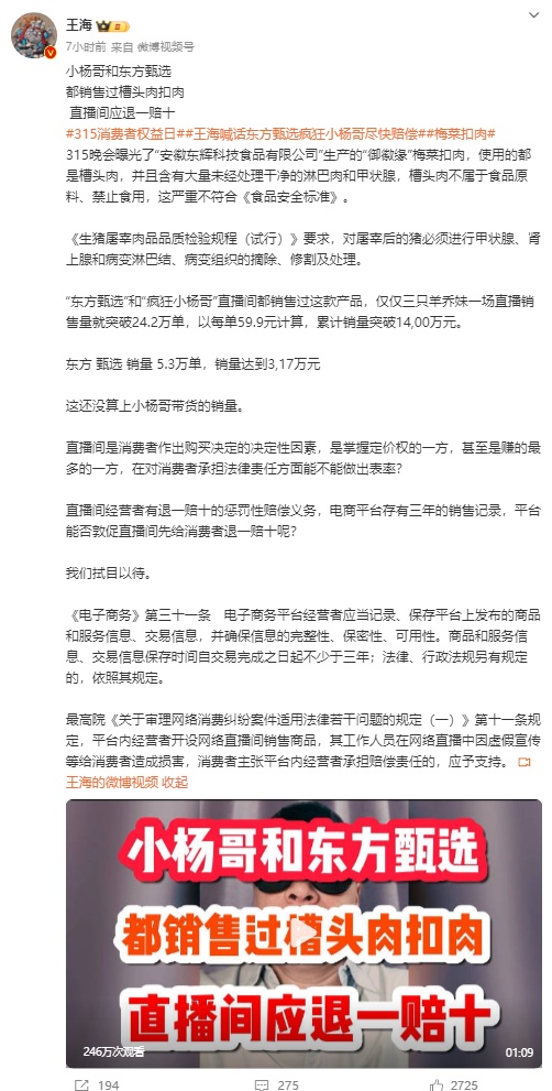 3月16日,打假人@王海 称,小杨哥和东方甄选都销售过被315晚会曝光的槽头肉扣肉,其直播间应退一赔十。